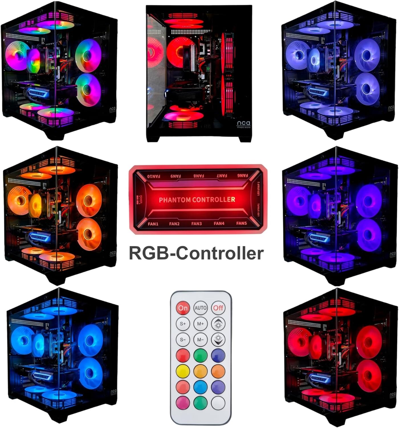 Die RGB-Beleuchtung lässt sich mit der mitgelieferten Fernbedienung steuern, es stehen zahlreiche Farben und Effekte zur Verfügung. Sogar die Geschwindigkeit lässt sich direkt steuern, sodass Sie die Lüfter bei Bedarf einfach komplett ausschalten können und der PC kaum zu hören ist.