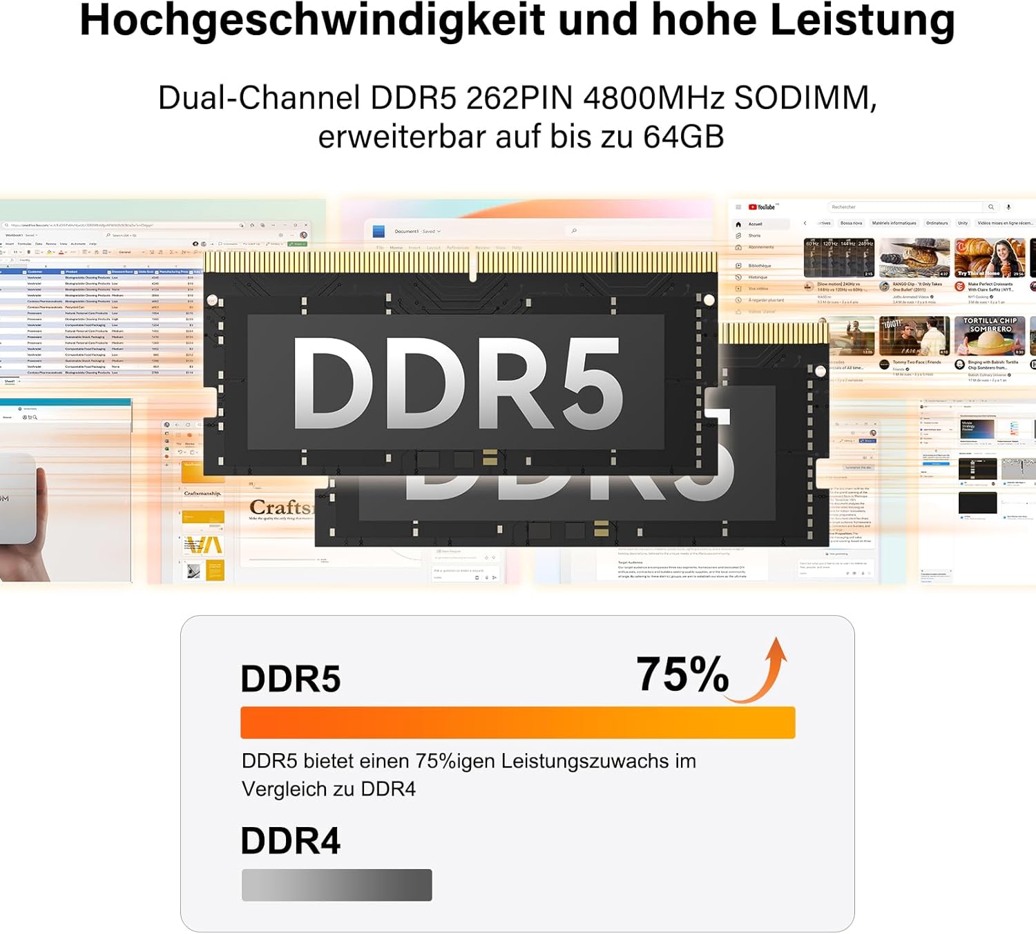 Schneller Speicher und Arbeitsspeicher: DDR5-RAM und PCIe-Gen3-SSD ermöglichen Ihnen ein reibungsloses Arbeiten mit Apps, Browsern und Kreativtools. Speichern Sie Hunderte von Fotos, Dokumenten und Medien – und das alles blitzschnell. Dank des erweiterbaren M.2-Steckplatzes (unterstützt bis zu 1 TB zusätzlichen Speicher) passt sich der GEEKOM Mini-PC flexibel Ihren wachsenden Anforderungen an – perfekt für Projekte mit großen Dateien oder Spielebibliotheken.