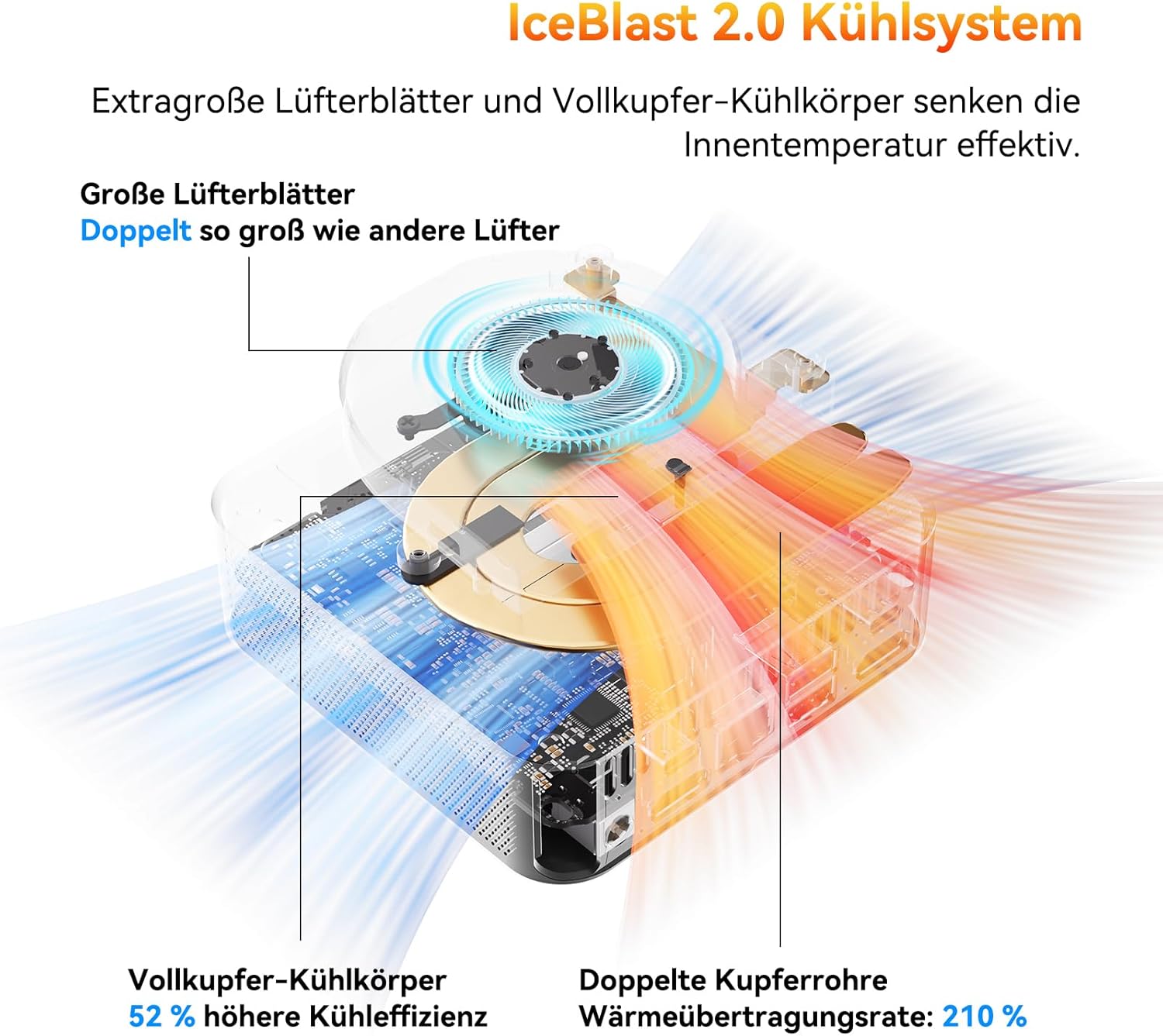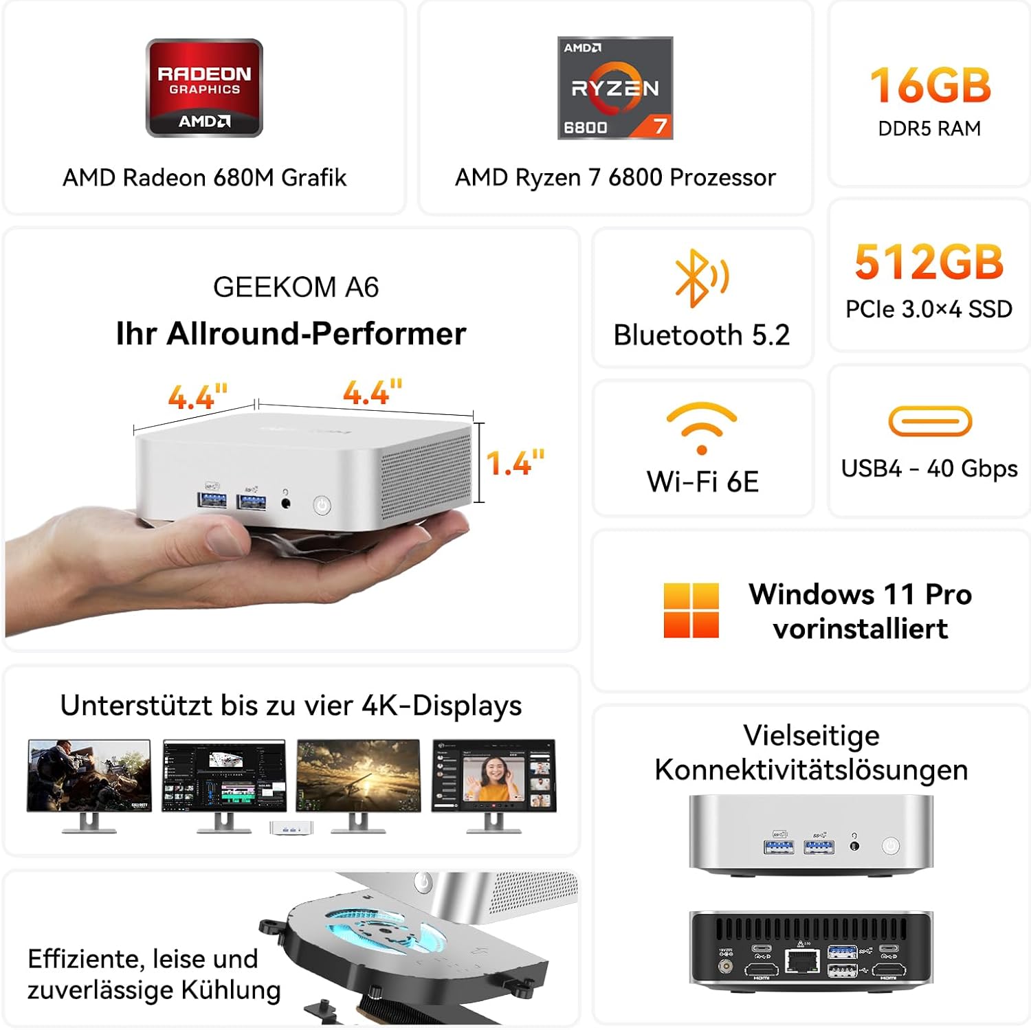 Fortschrittliche Kühlung für Spitzenleistung: Der Mini-Computer ist mit der GEEKOM IceBlast-Kühltechnologie ausgestattet, die auch bei hoher Arbeitsbelastung für Effizienz sorgt. Das innovative Luftstromdesign und die hintere Abluftöffnung halten das System kühl und leise. Dies sorgt für optimale Leistung bei anspruchsvollen Aufgaben wie Gaming oder Videobearbeitung ohne störende Geräusche oder Überhitzung.