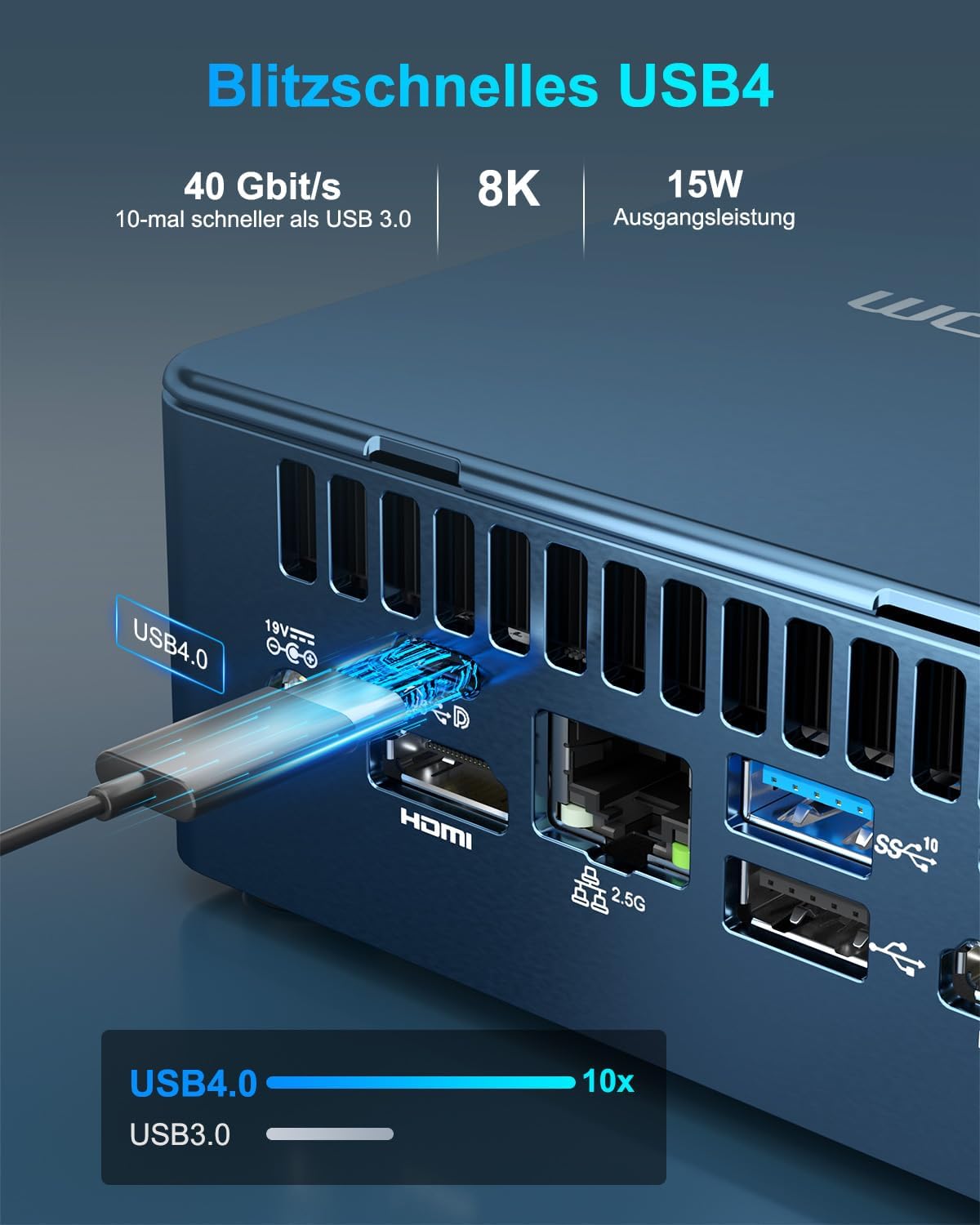 2.5G LAN / WiFi 6E / Bluetooth 5.2: The mini computer is equipped with WiFi 6E and supports 2.5 G, 5 G and 6 G (triple band) for a fast Internet connection and high-speed surfing without cables. A 2.5 Gigabit Ethernet port (LAN) is available for extremely high transfer rates. And via Bluetooth 5.2, peripherals such as headsets, mouse or keyboards can be connected quickly and securely.