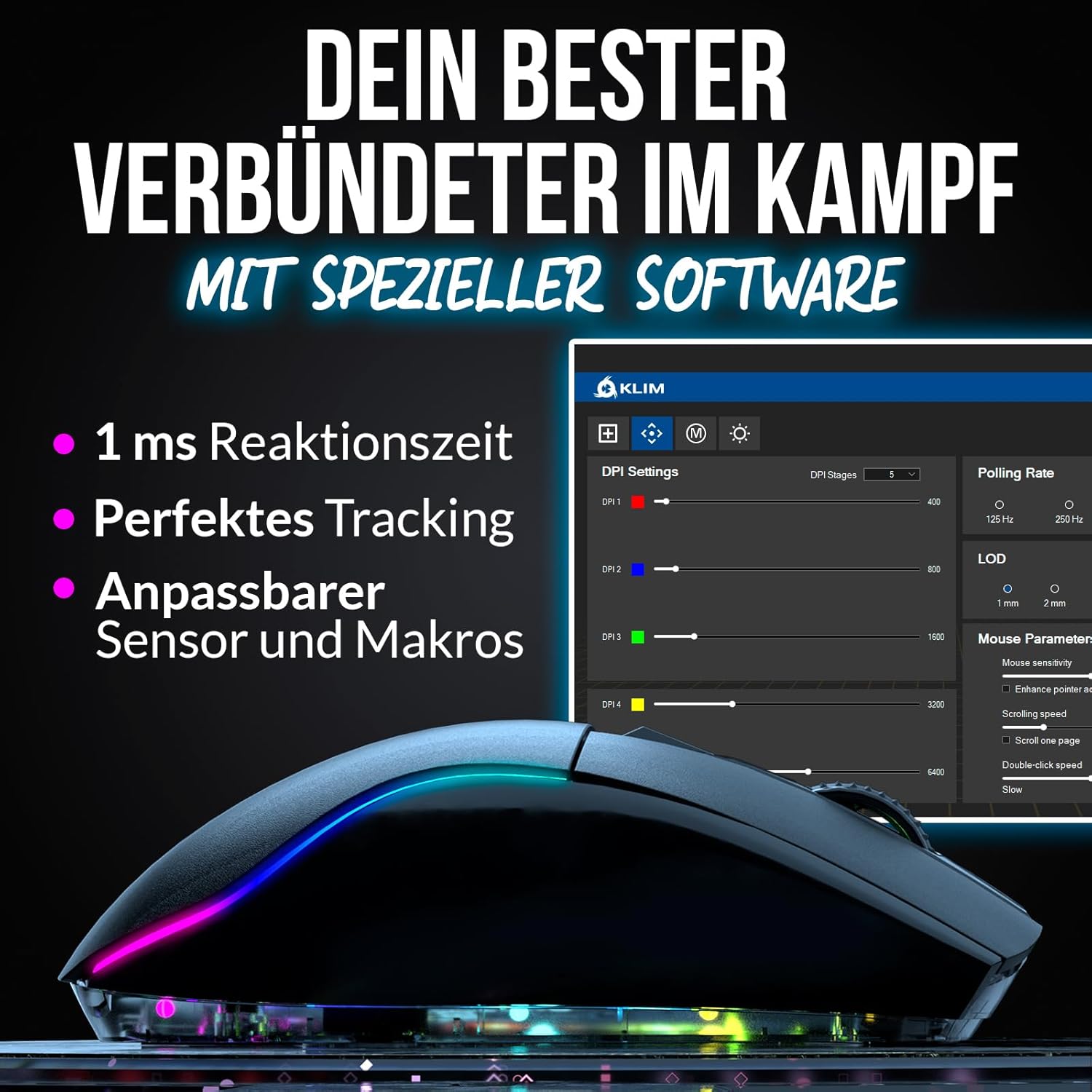 Ja, du kannst eine Anpassungssoftware herunterladen (nur Windows), um die Tasten neu zu binden, die Mauseinstellungen zu ändern, die RGB-Farben und -Effekte anzupassen und nützliche Makros einzurichten.