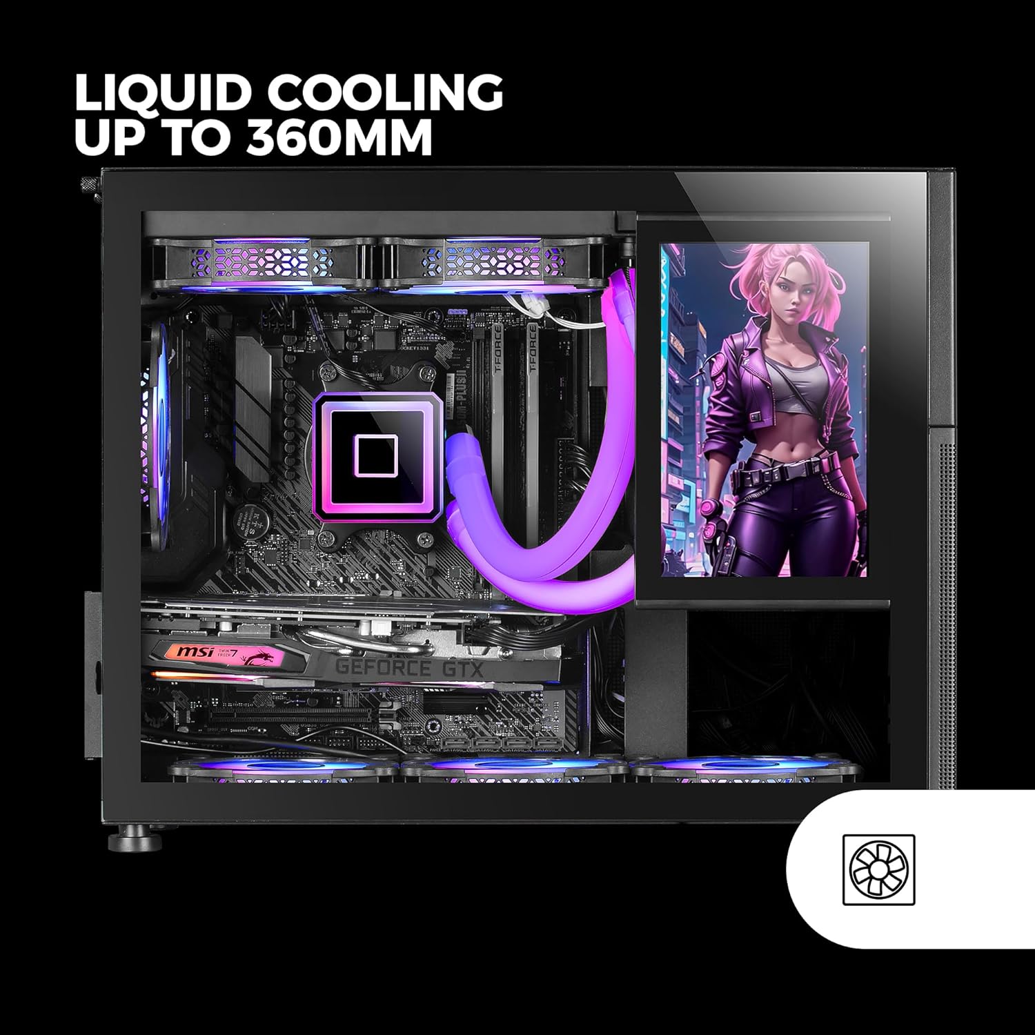 BENUTZERFREUNDLICHES DESIGN Das maßgeschneiderte Premium-MC-LCD-Gehäuse mit einer robusten Stahlkonstruktion kommt ohne vorinstallierte Elemente aus und ermöglicht Ihnen die Integration Ihrer Lieblingskomponenten von Lüftern, vertikalen Grafikkartenadaptern oder Flüssigkeitskühlsystemen bis zu 360 mm. Es verfügt außerdem über USB 3.0-Konnektivität, HD-Audio und USB-C-Anschluss und integriert einen 8-Zoll-IPS-Bildschirm
