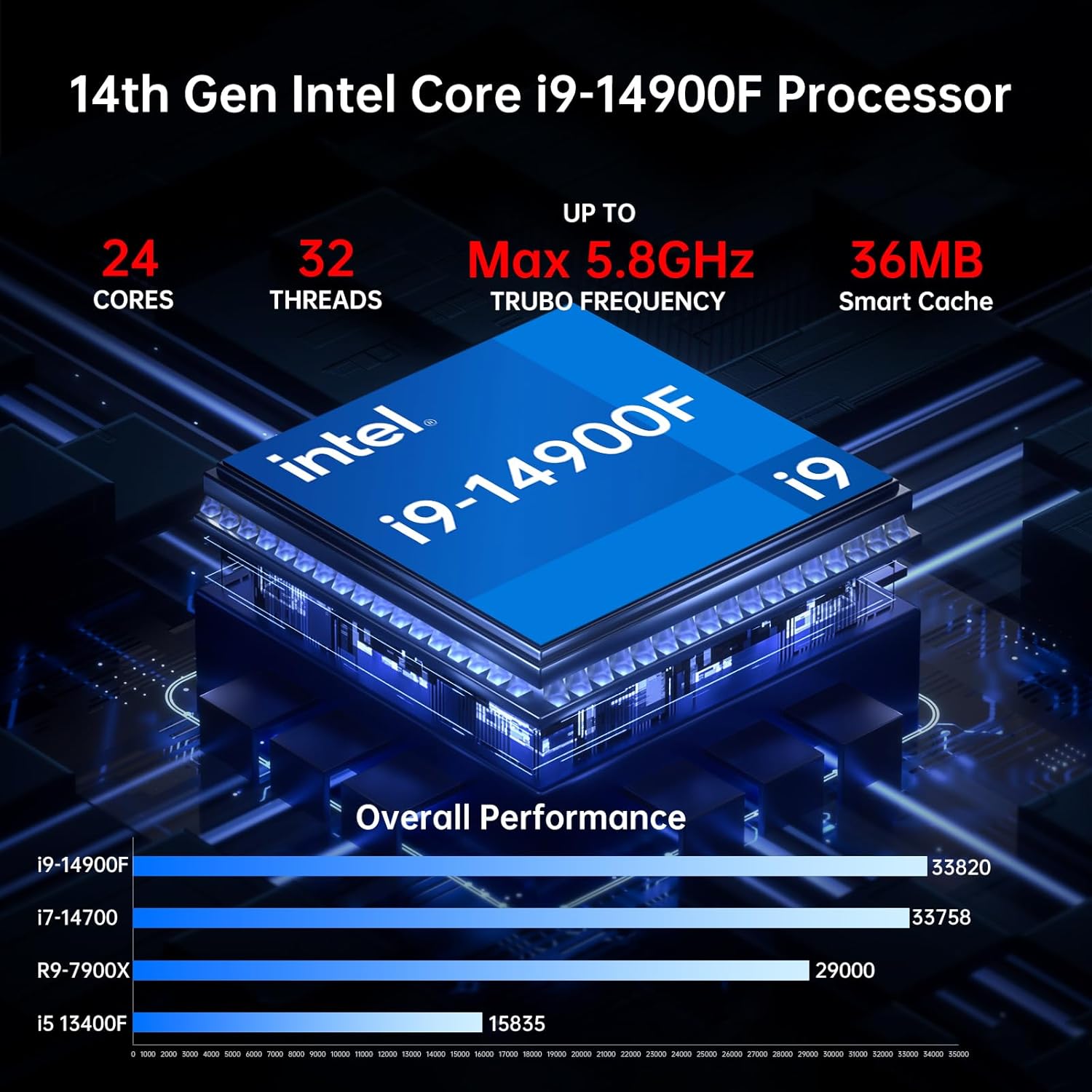Mit CPU der 14. Generation: Dieser Mini-Computer ist mit einem leistungsstarken Core i9-14900F-Prozessor ausgestattet. 24 Kerne, 32 Threads, 36 MB Cache. Die Prozessortaktfrequenz beträgt bis zu 5,8 GHz. Es bietet starke Leistung. Dieser Mini-PC eignet sich für Videobearbeitung, KI-Aufgaben, Musikproduktion, Videoüberwachung, Grafikdesign, CAD, Videospiele und die Industrie.