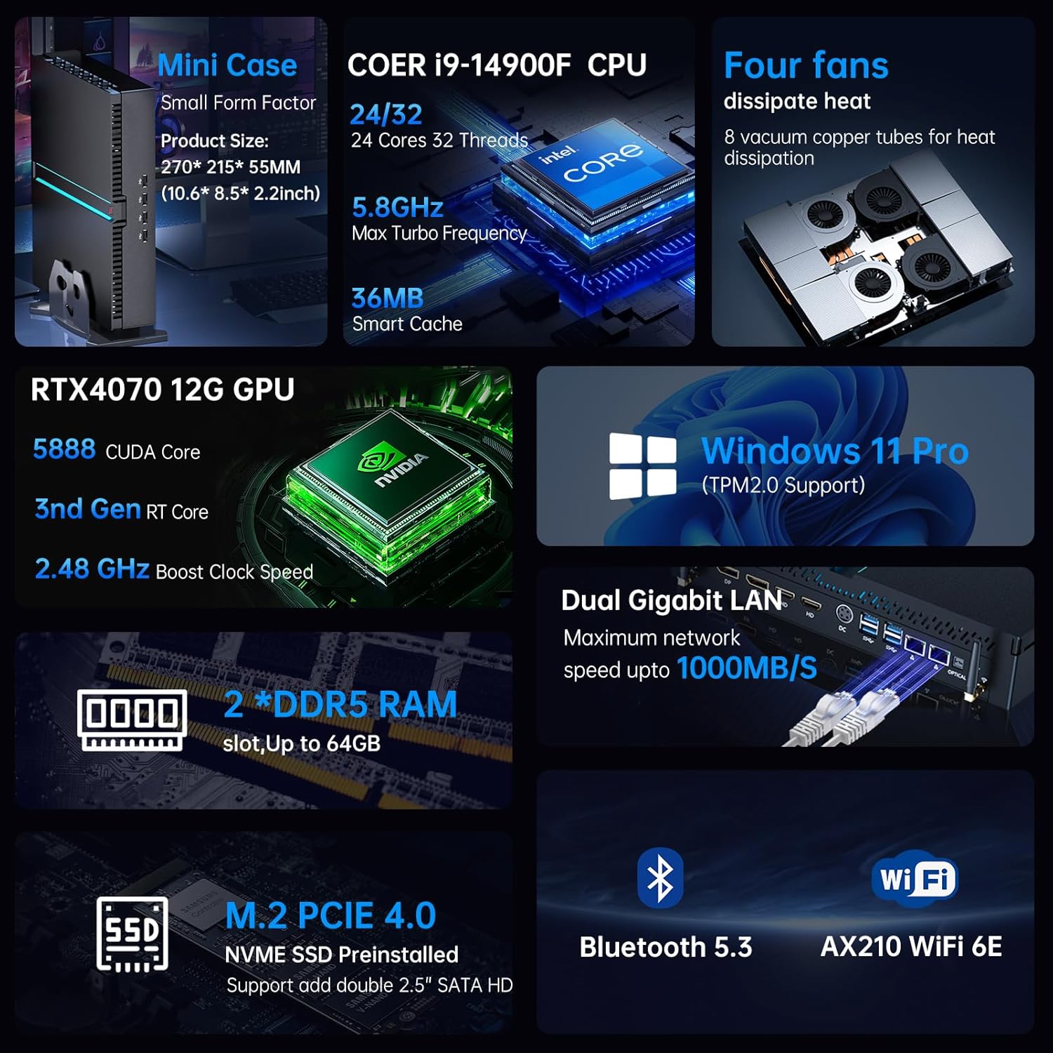 Mini Desktop Computer, Intel Core i9-14900F 14th Gen 24-Core Processor, 64GB DDR5 RAM, 4T PCIE 4.0 SSD, GeForce RTX 4070 12GB GDDR6 Graphics, WiFi 6e, 8K, Four Displays, Windows 11 Pro