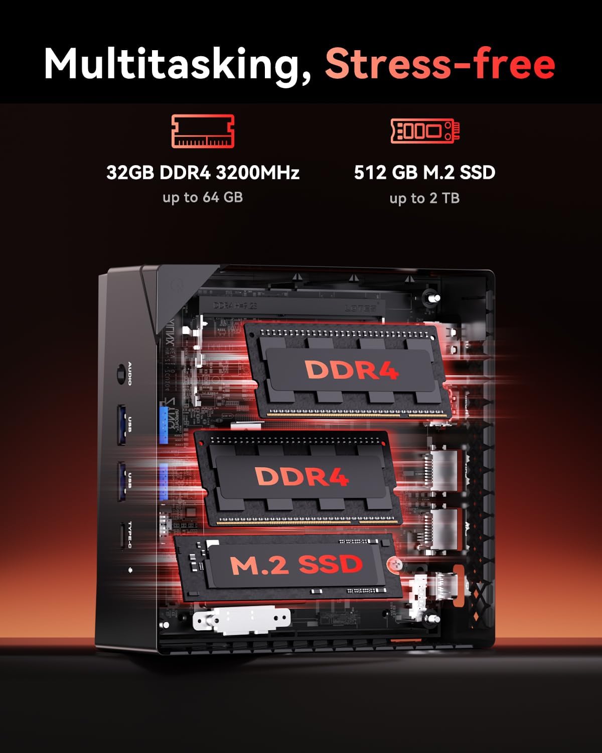 32GB DDR4 + 1024GB M.2 SSD, flexible expansion: the mini gaming PC AM06 PRO has 32 GB DDR4 RAM, dual channel DDR4, expandable to a maximum of 64 GB (2 x 32 GB) and 1024 GB M.2 SSD (expandable to a maximum of 2TB), this mini computer has a powerful charging function and ensures that your data fast and efficiently charged. In addition, it supports up to 2TB external 2.5″ SSD/HDD expansion, allowing you to record system files and more games.