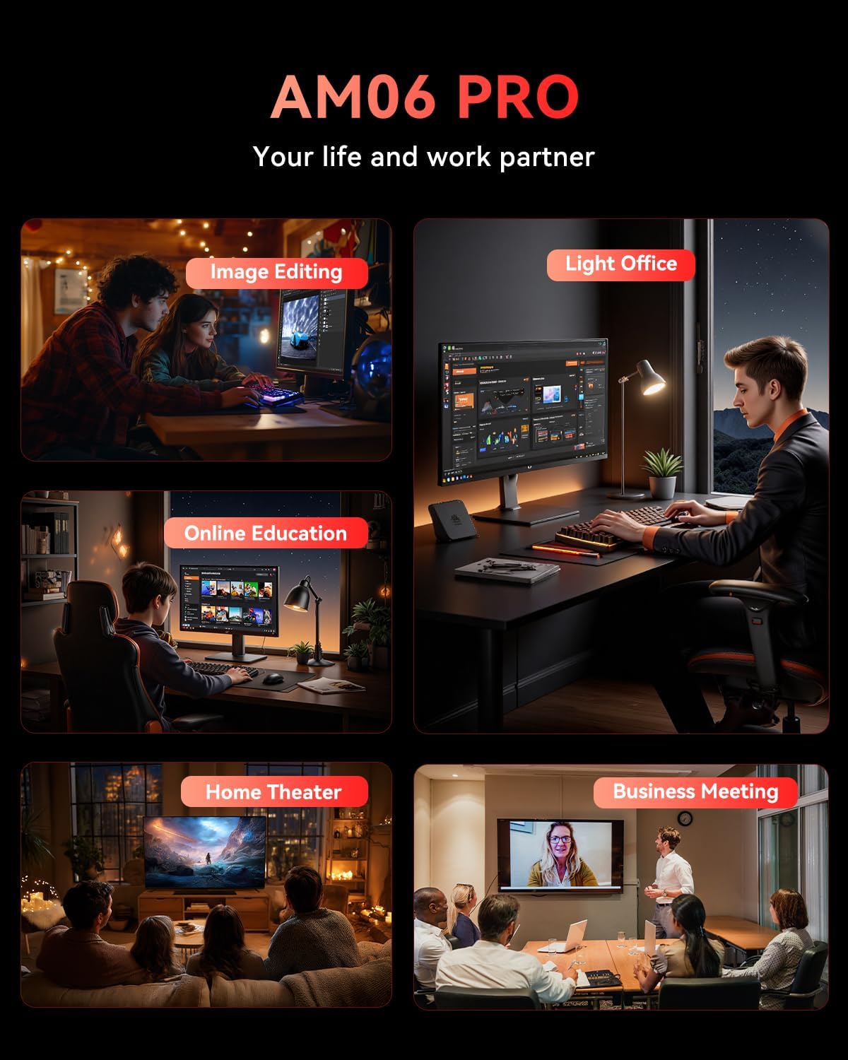 4K triple display and Type-C: AM06 Pro mini computer integrates АMD Radeon Graphics 2000 MHz 8 cores and offers excellent graphics performance, smooth 4K HD video and easy handling of casual games and creative applications. The HDMI, DP and Type-C port configuration provides a 4K UHD triple display, expands your work area and improves your work efficiency. Whether office work, home entertainment or creative work, the AM06 PRO is an excellent choice.