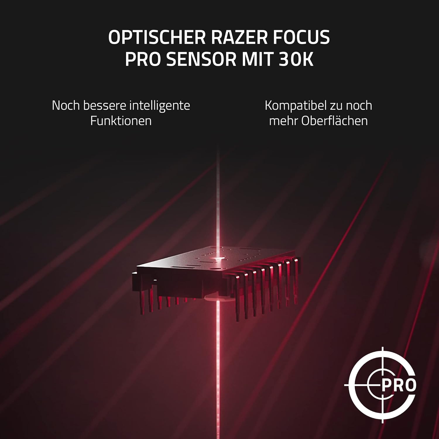 Optischer Razer Focus Pro-Sensor mit 30K-Klassenbester Präzision: Dieser brandneue Sensor von Razer gewährleistet eine fehlerfreie Tracking-Leistung auf einer Vielzahl von Oberflächen, einschließlich Glas, ergänzt durch intelligente Funktionen für noch besseres Zielen und mehr Kontrolle.