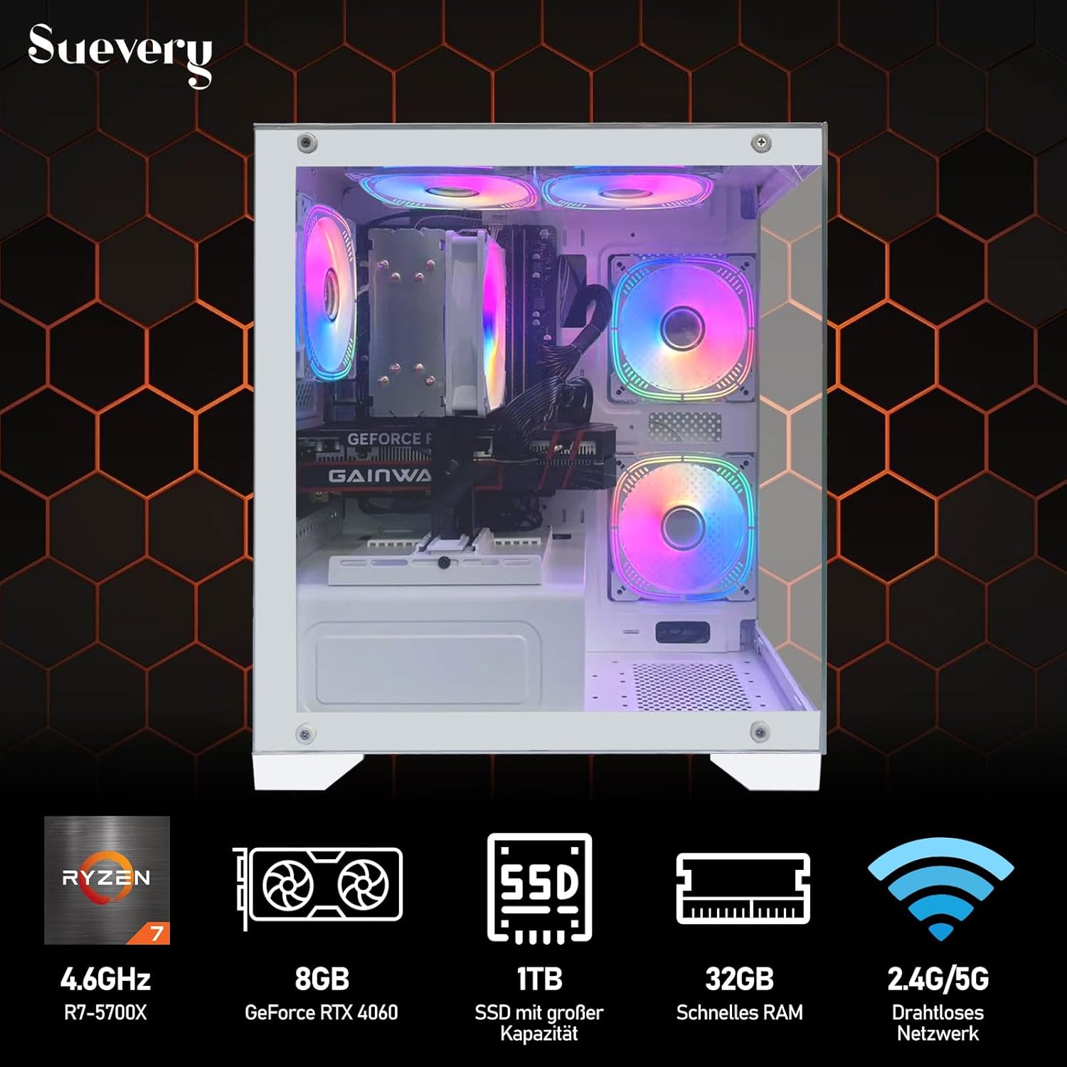Ryzen 7 5700X Gaming PC (8 Cores 16 Threads, up to 4.6 GHz) Desktop Computer Tower RTX 4060 8GB | 32GB RAM | 1TB NVMe SSD | WLAN | Win 11 | Prebuilt Gamer PC (White)