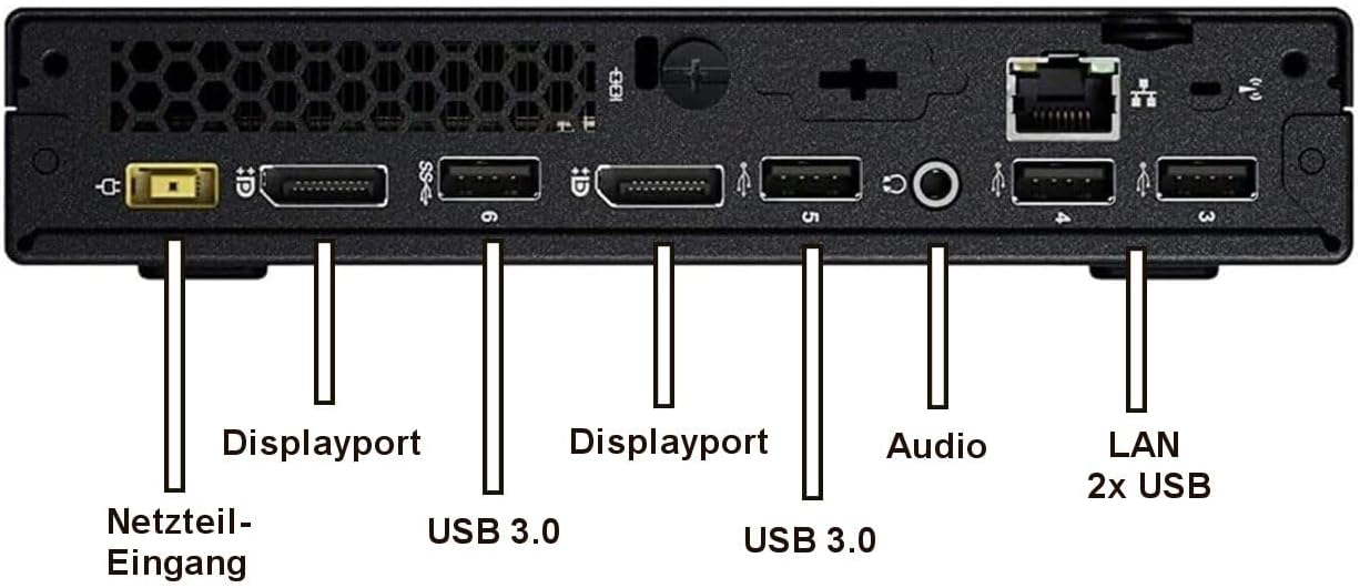 Anschlüsse: 2 x Display-Port, 3 x USB 3.0, 2 x USB 2.0, Gigabit LAN, WLAN, 2 x Audio.