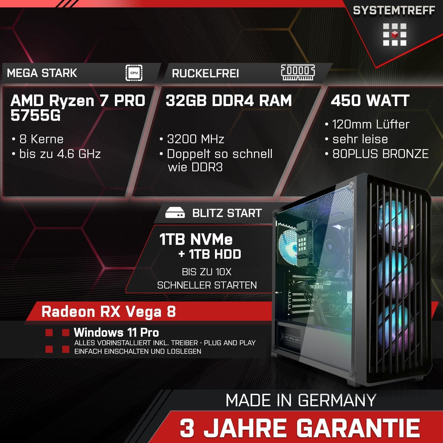 SYSTEMTREFF Basic Gaming PC AMD Ryzen 7 5700G 8×4.6 GHz, AMD Radeon RX Vega 8 4K HDMI DX12, 1 TB M.2 NVMe + 1 TB HDD, 16 GB DDR4 RAM, Wi-Fi Desktop Computer for Gaming, Windows 11 Pro