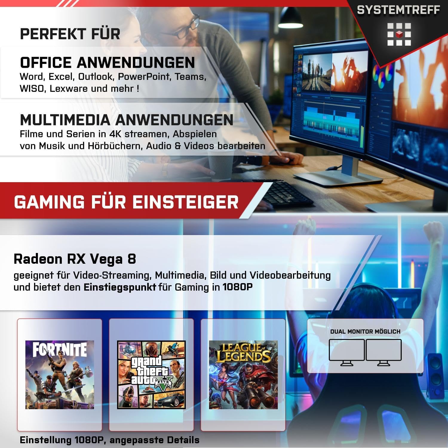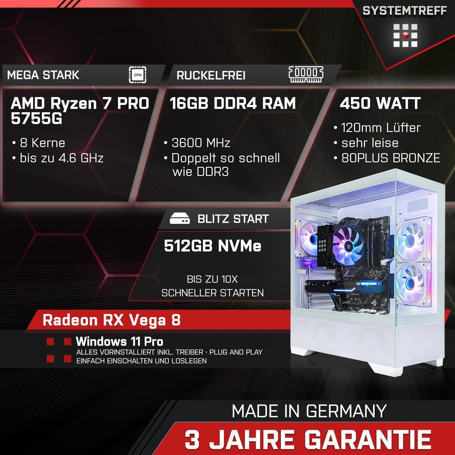 SYSTEMTREFF Basic Gaming PC White AMD Ryzen 7 PRO 5755G 8 x 4.6GHz | Radeon RX Vega 8 4K HDMI DX12 | 512GB M.2 NVMe | 16GB DDR4 RAM | Windows 11 | WLAN Desktop Computer Calculator for Gamers, Gamers