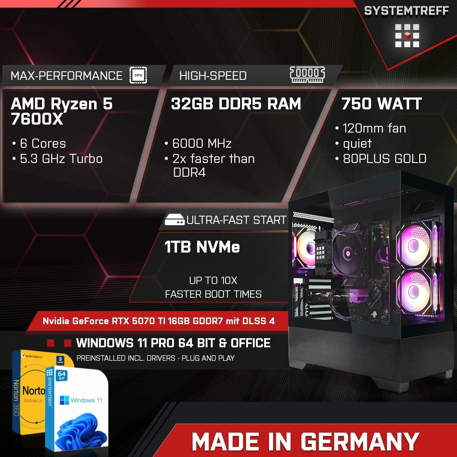 SYSTEMTREFF High-End Gaming PC AMD Ryzen 5 7600X 6×5.3GHz | Nvidia RTX 5070 TI 16GB DX12 | 1TB M.2 NVMe | 32GB DDR5 RAM | Windows 11 | WLAN Desktop Computer Calculator for Gamers, Gamers & Streamers