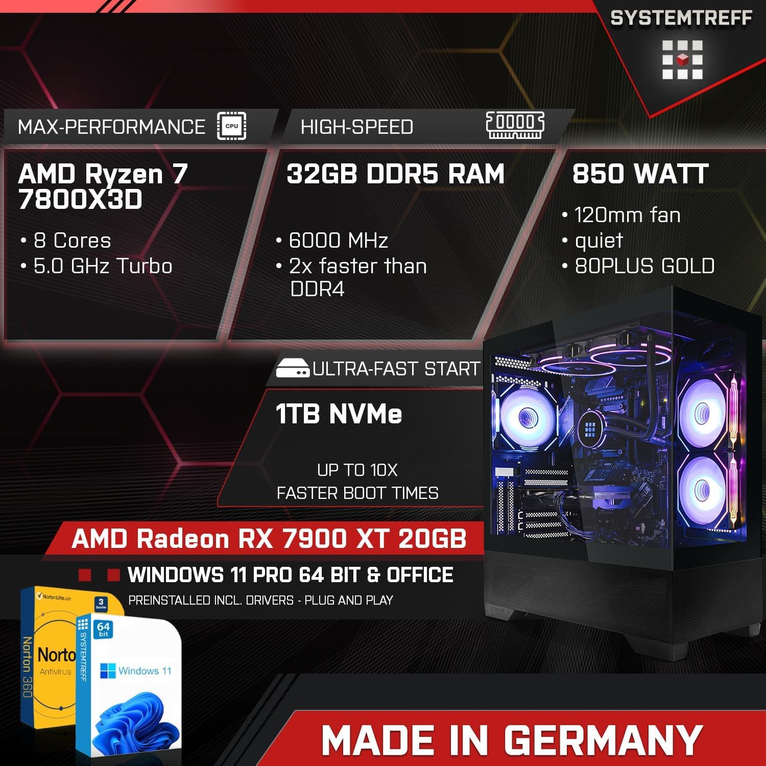 SYSTEMTREFF High-End Gaming PC AMD Ryzen 7 7800X3D 8x5GHz | AMD Radeon RX 7900 XT 20GB DX12 | 1TB M.2 NVMe | 32GB DDR5 RAM | Windows 11 | WLAN Desktop Computer Calculator for Gamers, Gamers &
