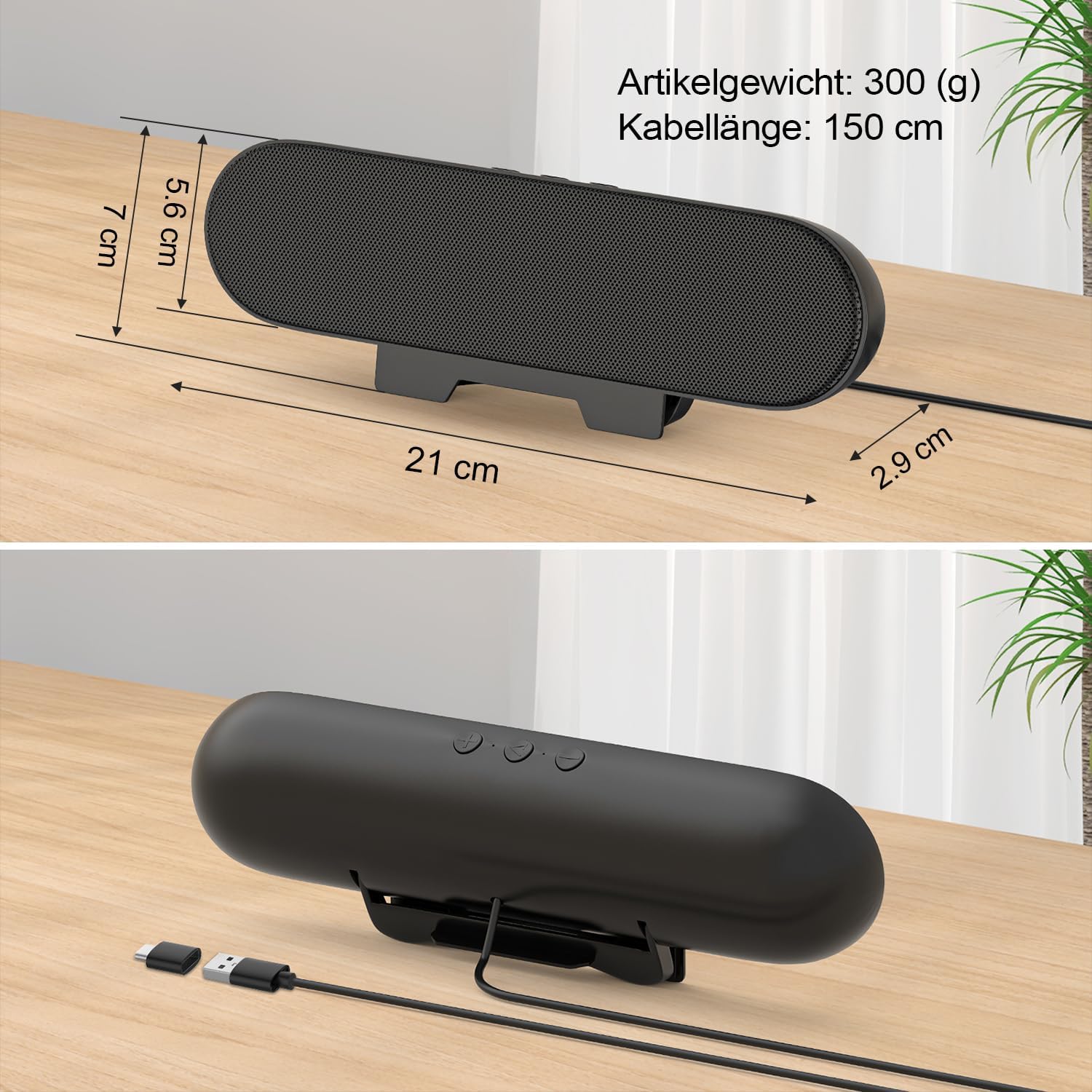 Klemmbildschirm-Design: Das Klemmbildschirm-Lautsprecherdesign passt perfekt über oder unter den Computerbildschirm. Die 3,5-mm-AUX- und Kopfhöreranschlüsse entfallen, wodurch Platz auf dem Schreibtisch frei wird und Kabelgewirr vermieden wird.