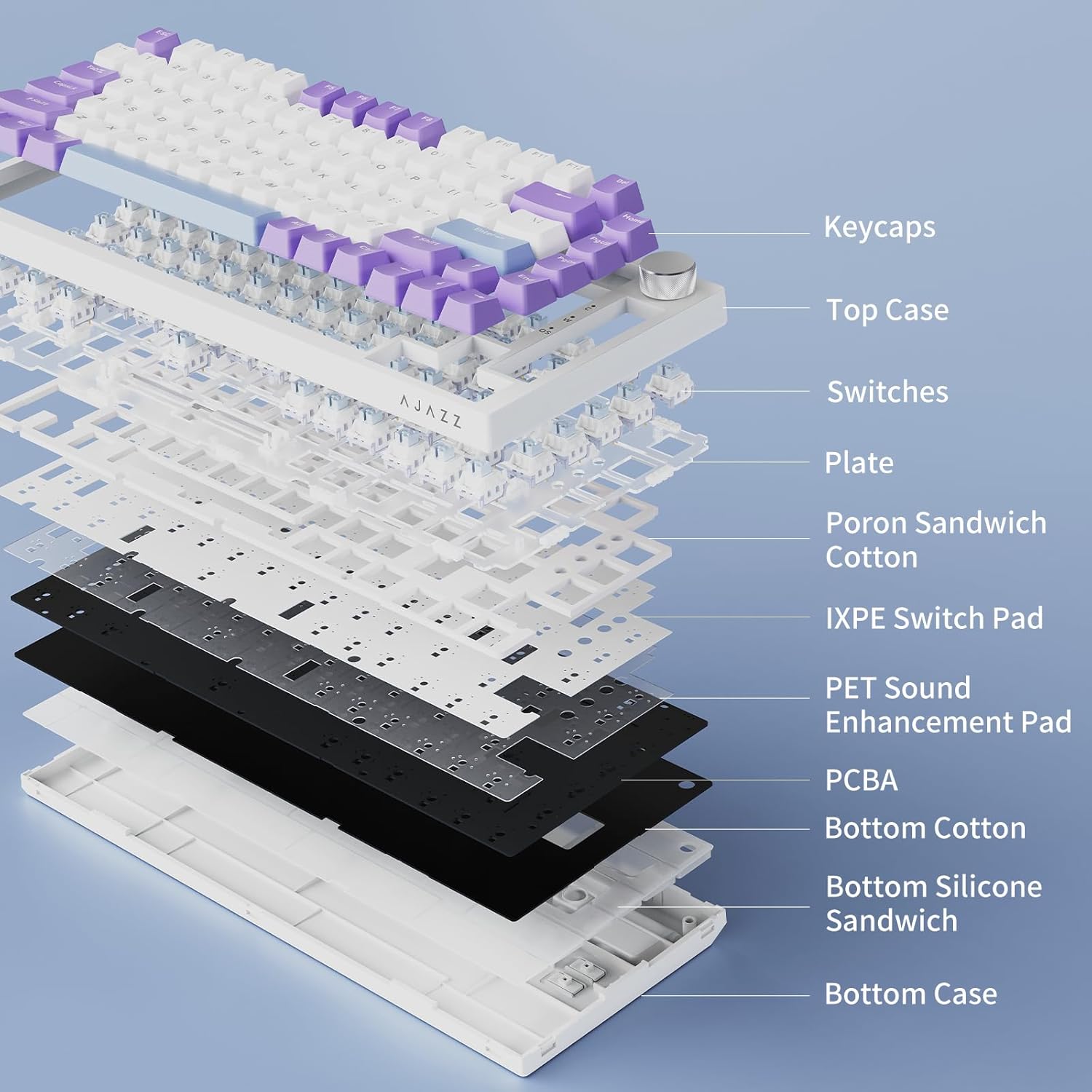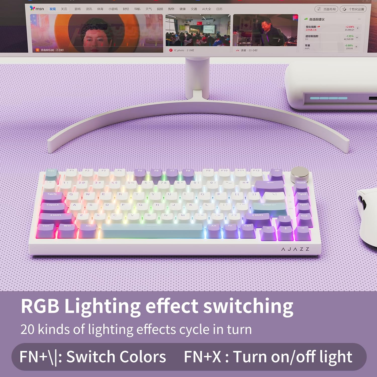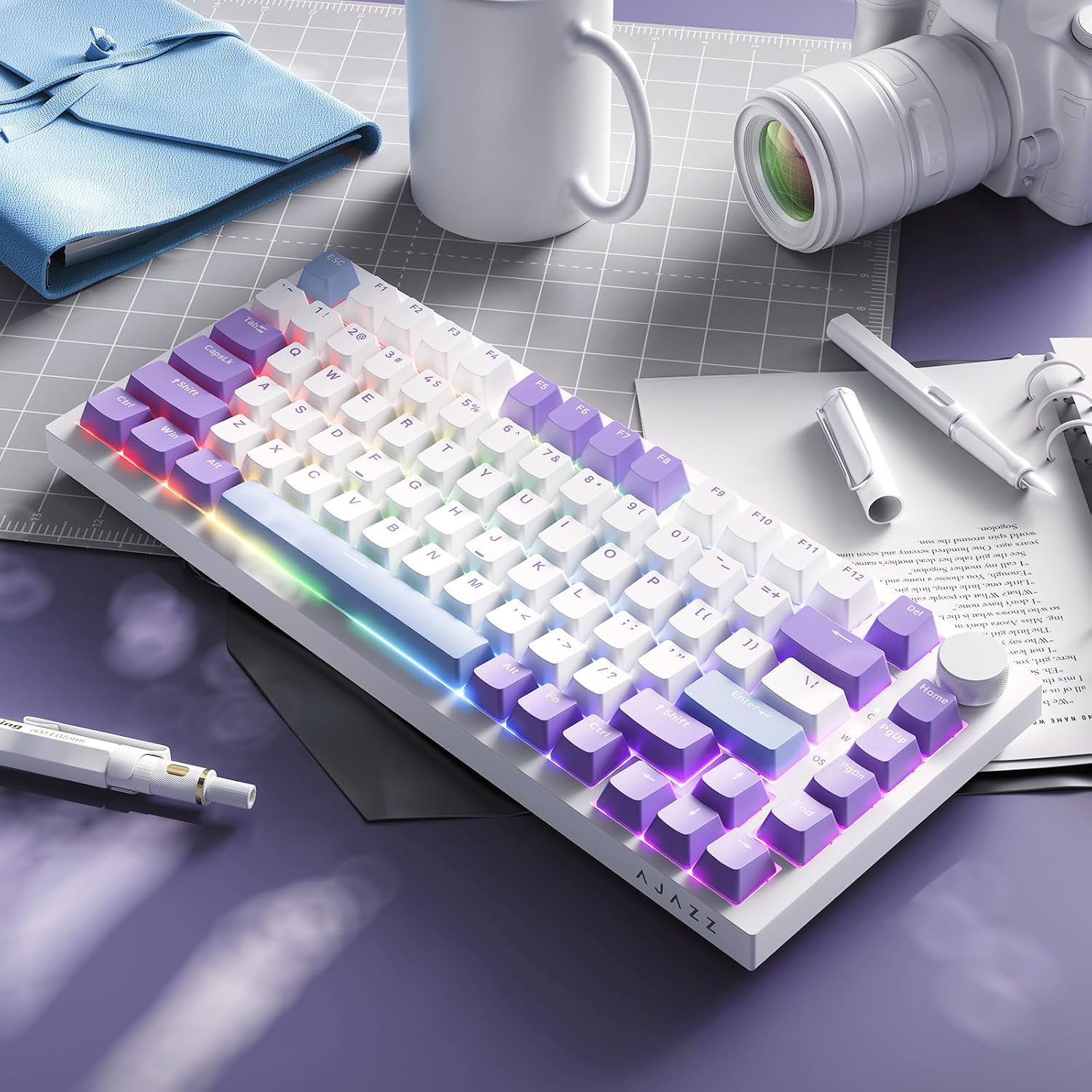 AJAZZ AK820 Wired Mechanical Keyboard, 75% Gaming Keyboard with Volume Control Knob, PBT Keycaps, 82 Keys, Five-Layer Sound Insulation Pad, South-Oriented RGB, Full-Key Hot Swap, Blue White Purple