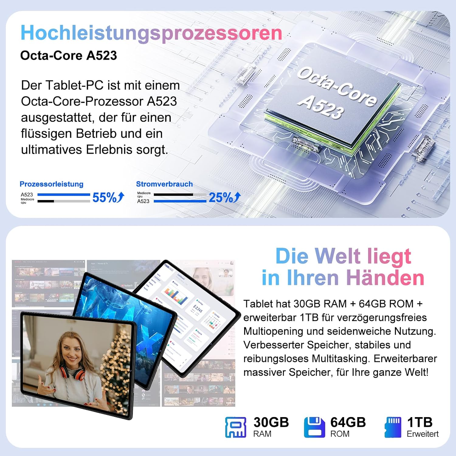 30 GB RAM + GMS: Das 10-Zoll-Tablet verfügt über bis zu 30 GB RAM und 64 GB Speicherplatz und unterstützt SD-Kartenerweiterungen von bis zu 2 TB. Ob Sie mehrere Anwendungen gleichzeitig ausführen, anspruchsvolle Spiele genießen oder hochauflösende Videobearbeitung und Dokumentenverarbeitung durchführen – es sorgt für herausragende Leistung. Das Tablet verfügt über eine GMS-Zertifizierung und der Store bietet Millionen von Apps in verschiedenen Kategorien. Von Bürosoftware bis hin zu beliebten Spielen ist alles einfach herunterzuladen.
