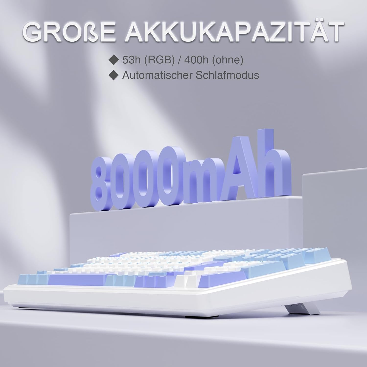 RGB 8000 mAh Akku: Diese RGB-Tastatur bietet 20 dynamische Lichteffekte mit über 16,8 Millionen Farboptionen für ein beeindruckendes visuelles Erlebnis. Die nach unten gerichteten LEDs (nach Süden ausgerichtet) sorgen für eine besonders gleichmäßige und angenehm dezente Beleuchtung – perfekt, um beim Gaming oder im Büro durch Ausschalten der Beleuchtung für konzentriertes Arbeiten eine immersive Atmosphäre zu schaffen. Ausgestatteter 80.00-mAh-Akku: 53 Stunden mit RGB-Beleuchtung, 400 Stunden ohne Beleuchtung