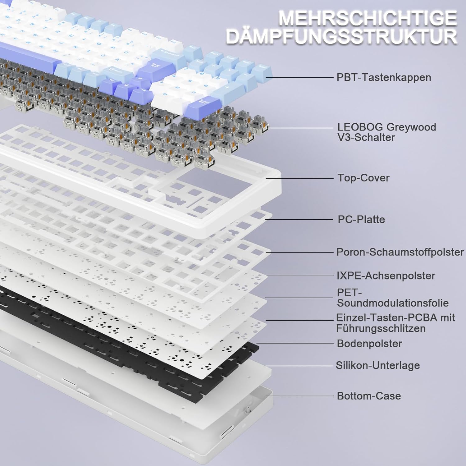 Dichtungsaufbau: AULA F99 Gaming-Tastaturen für PC überzeugen durch einen innovativen Dichtungsaufbau, der durch eine integrierte Silikon-Dämpfungsschicht und eine Platine mit individuellen Schalteraussparungen optimiert wurde. Die Konstruktion verbessert sowohl die Elastizität als auch die Stabilität und vermittelt ein angenehm weiches, federndes Tippgefühl. Zwischen Platine, Trägerplatte und Schaltern, dem störenden Hohlraum, sind fünf präzise abgestimmte Schalldämmschichten verbaut. Geräusche im Tastenanschlag werden effektiv eliminiert