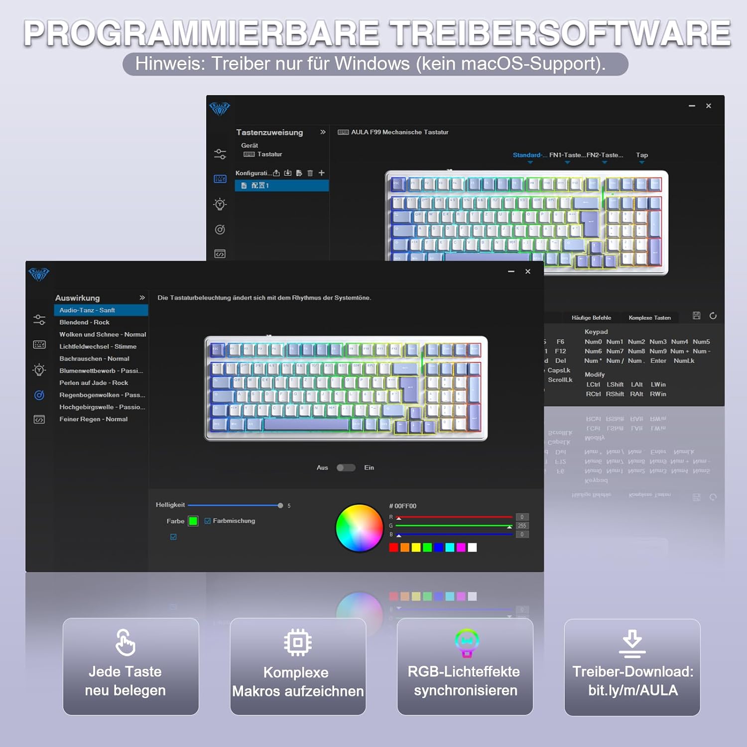 Makro-Programmiersoftware: Diese Treibersoftware wurde entwickelt, um das volle Potenzial Ihrer Tastatur auszuschöpfen. Sie können RGB-Lichteffekte anpassen, Makrobefehle programmieren, Tasten neu belegen und praktische Tastenkombinationen für optimierte Arbeitsabläufe und Gaming-Vorteile einrichten, die eine echte Individualisierung ermöglichen. Wichtiger Hinweis: Die Treibersoftware unterstützt derzeit nur Windows. Systeme und ist nicht für Mac verfügbar