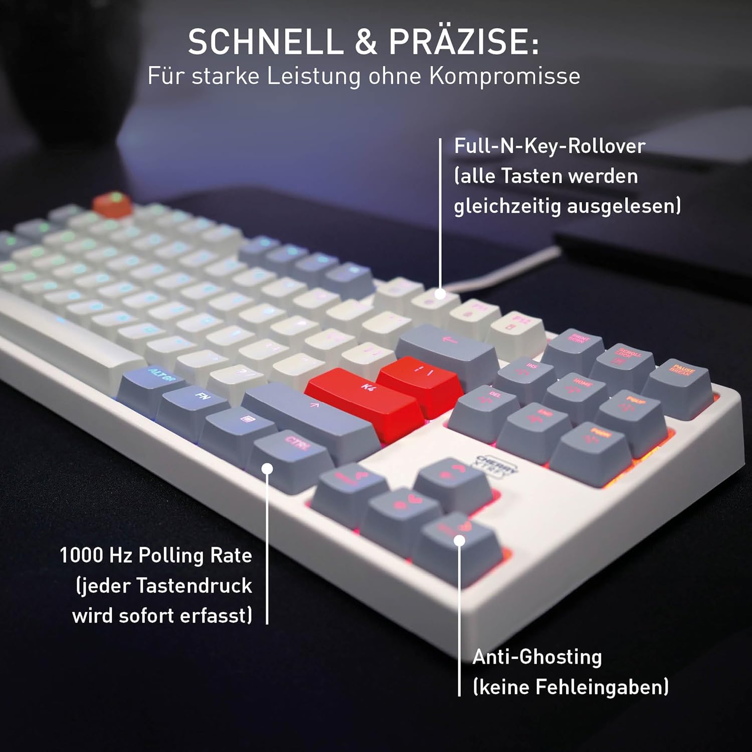 Hochwertige mechanische Cherry MX2A Red-Schalter: sanftes und direktes Tippgefühl mit linearer Schaltcharakteristik (ohne Klick) und mehr als 100 Millionen Betätigungen pro Taste