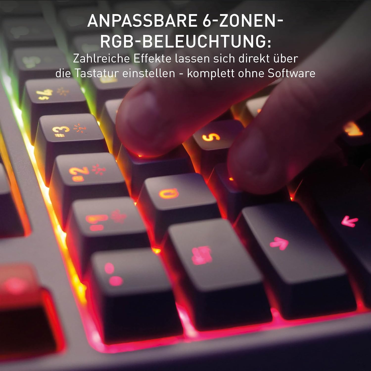 Beeindruckende RGB-Beleuchtung mit Farbanpassung in 6 Zonen der Tastatur: Zahlreiche Hintergrundbeleuchtungs- und Tippeffekte lassen sich ganz einfach ohne Software anpassen