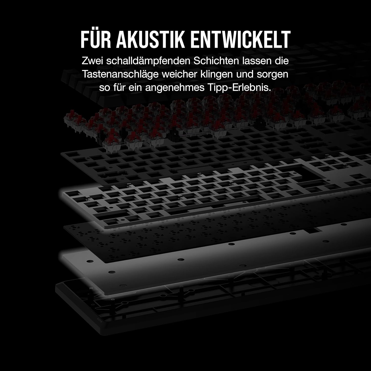 Tolles Erlebnis mit mechanischer Tastatur: vorgeschmierte lineare mechanische CORSAIR-Aktionsschalter (rot) für sanfte, schnelle Tastenanschläge, optimiert durch zwei Ebenen der Geräuschreduzierung für äußerst komfortables Spielen und Tippen
