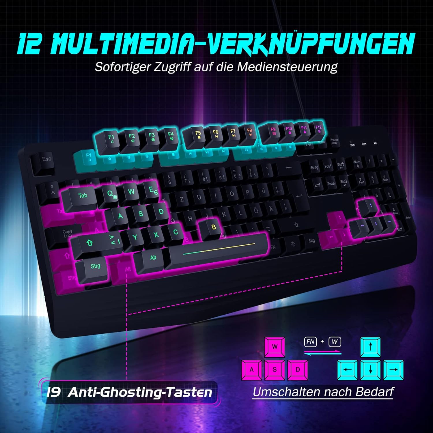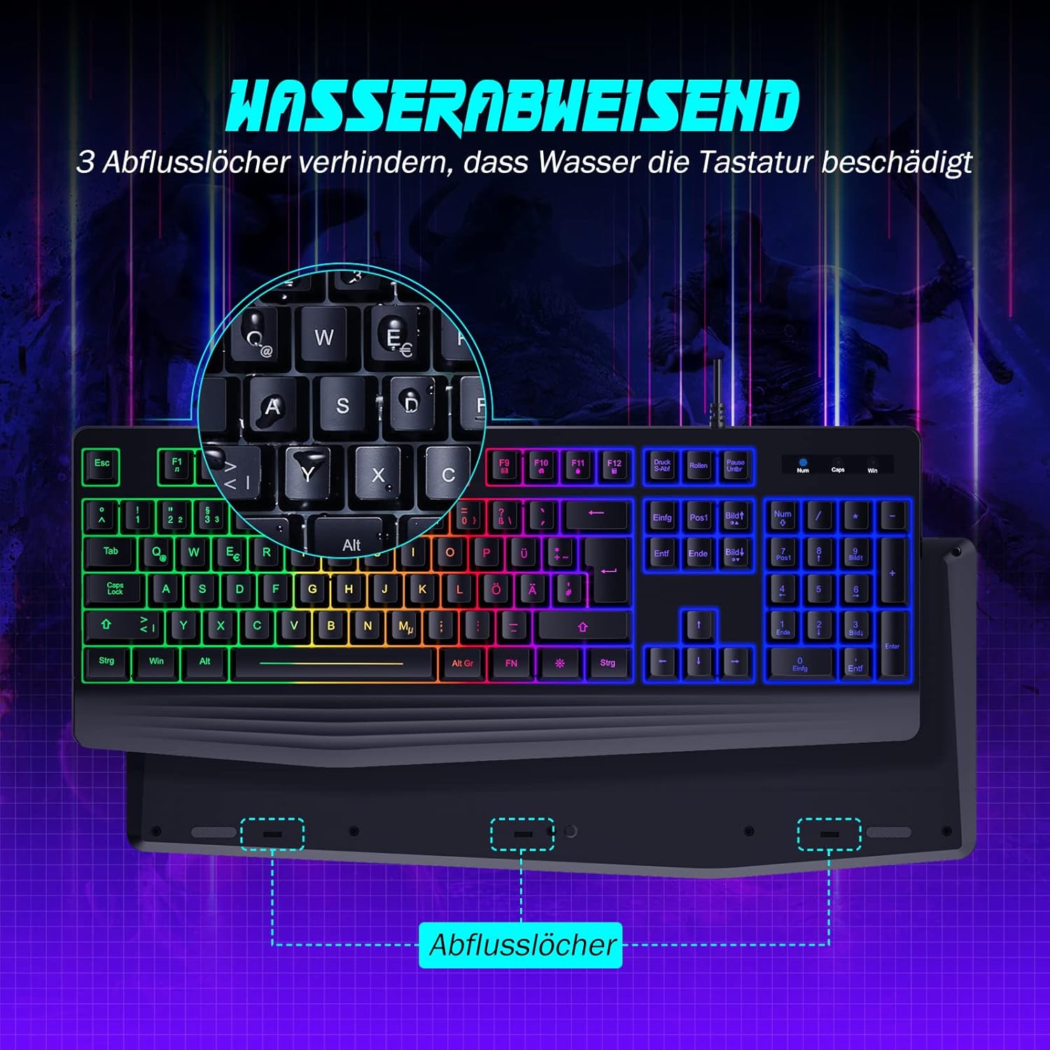 Gaming Keyboard PC, PS4 Keyboard USB, Rainbow Illuminated Keyboard LED, Durable, Ergonomic, Waterproof, Quiet Keys, Gaming Keyboard Ideal for PC, Mac, Xbox, PS4, Gamer, Office (German Layout)