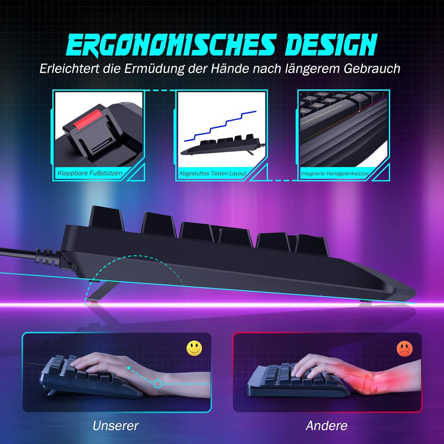 Ergonomische Handballenauflage: Die Gaming-Tastatur verfügt über eine integrierte ergonomische Handballenauflage, die eine angenehme Höhe bietet, um das Handgelenk bequem zu stützen. Das wissenschaftlich abgestimmte Tastenkappendesign ermöglicht einen einfachen Zugriff auf alle Tasten und maximiert den Handkomfort bei stundenlangem Spielen oder Arbeiten.