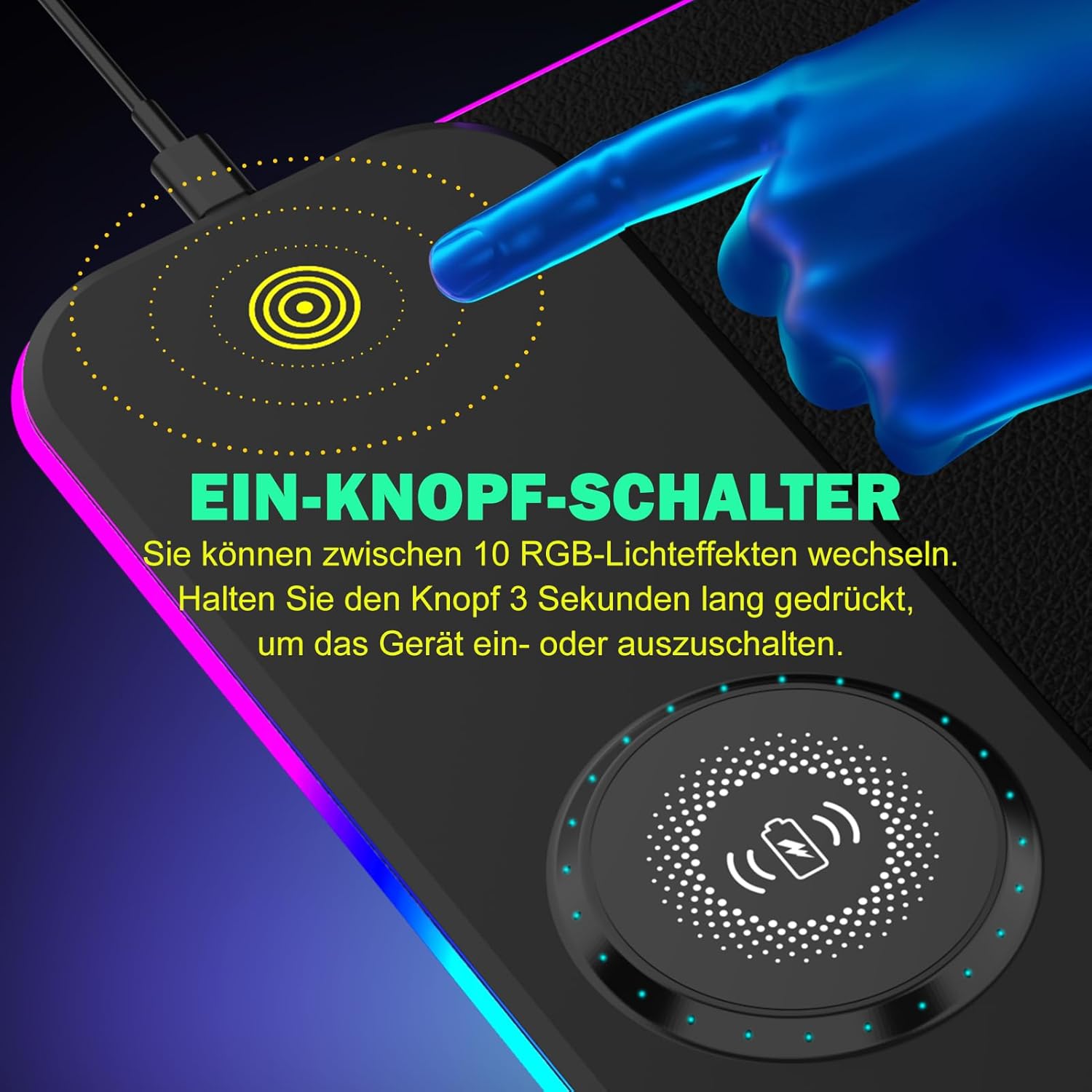 One-Touch-Steuerung – Eine Steuertaste ermöglicht das mühelose Umschalten der LED-Modi. 3 Lademodusanzeigen – rot für den Ladevorgang, grün für den vollständigen Ladezustand, gelb für den Standby-Modus. Eine Taste dient zum Ein-/Ausschalten der Lichtfarben. Wählen Sie den bevorzugten Farbmodus und genießen Sie Ihr Spielerlebnis.