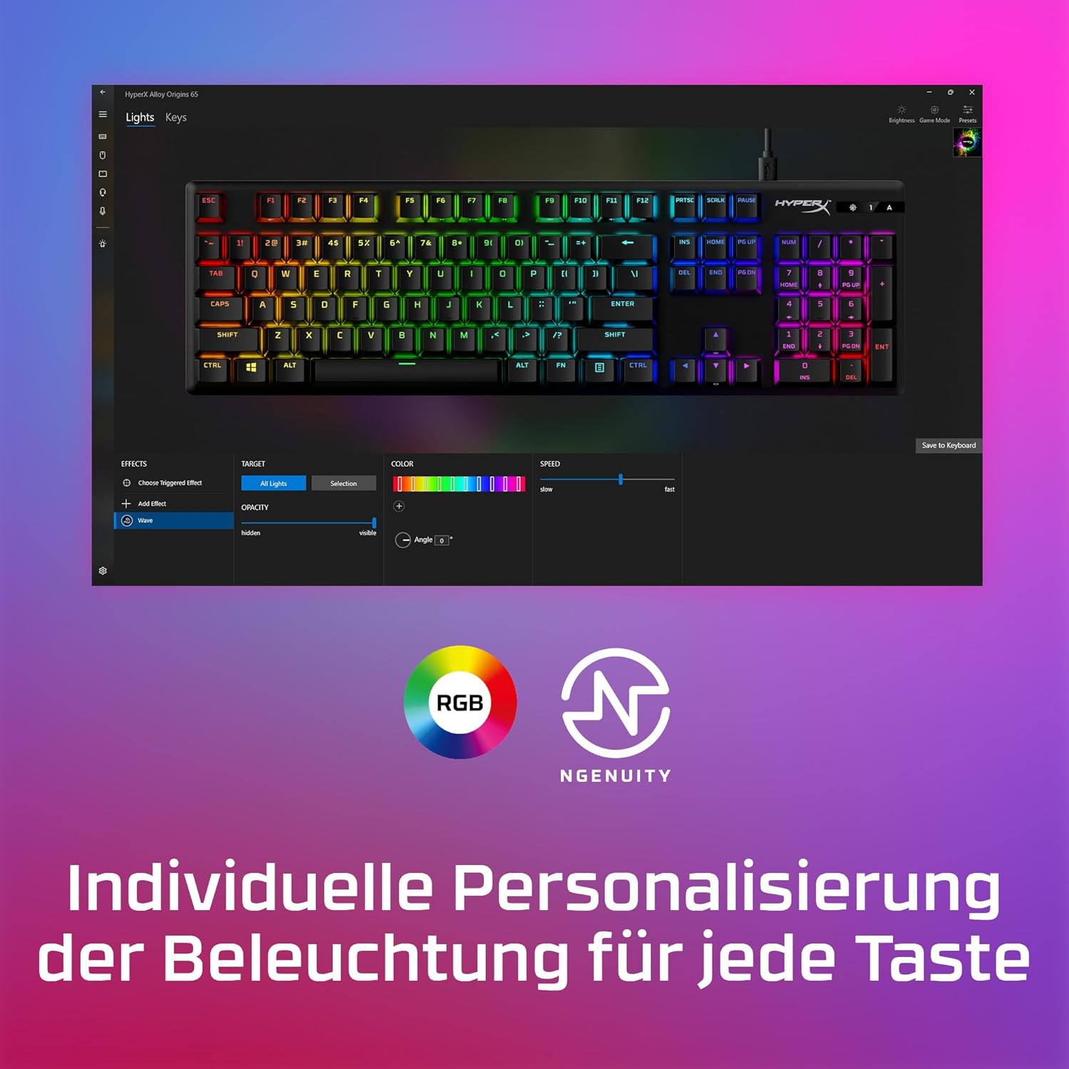 Individuell anpassbare RGB-Beleuchtung und Makros über die HyperX NGENUITY-Software: Mit der benutzerfreundlichen Software lassen sich Lichteffekte, Tastenbelegung und Gaming-Modus ganz einfach personalisieren
