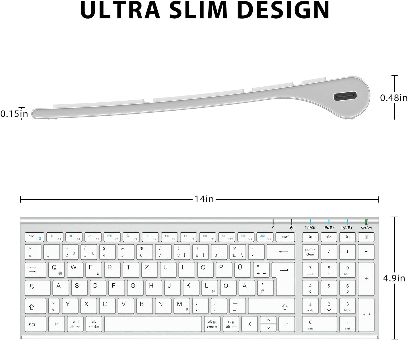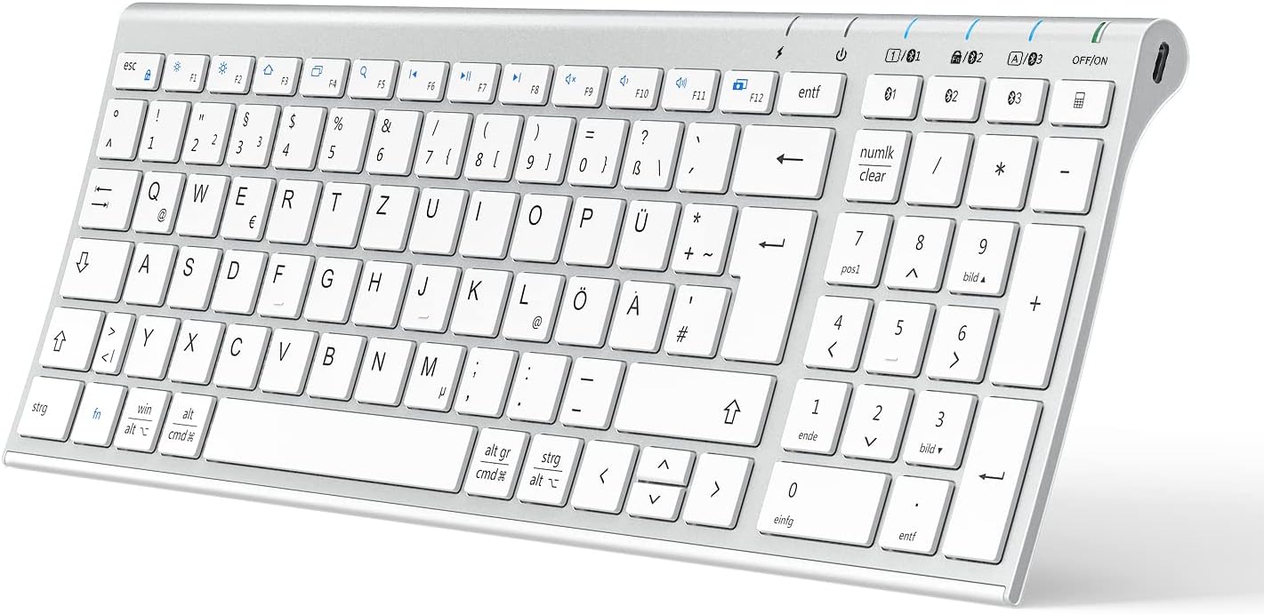 iClever Bluetooth Keyboard, BK10 Wireless Keyboard with 3 Bluetooth Channels, Ultraslim Rechargeable QWERTZ German Wireless Keyboard