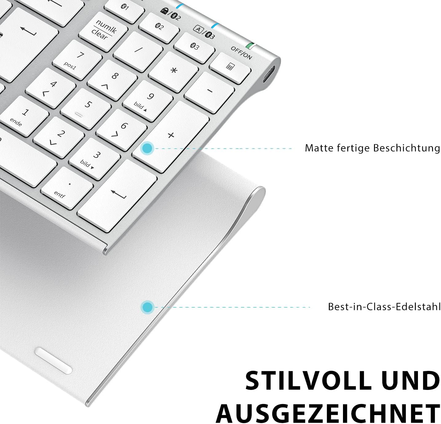 Ergonomisches Design für maximalen Komfort: Diese Tastatur besteht aus hochwertigem ABS-Material mit ergonomisch geneigten Füßen und reduziert die Belastung des Handgelenks auch nach langem Schreiben. Spritzwassergeschützt und resistent gegen Staub und versehentlich verschüttete Flüssigkeiten – für längere Haltbarkeit und weniger Reinigungsaufwand.