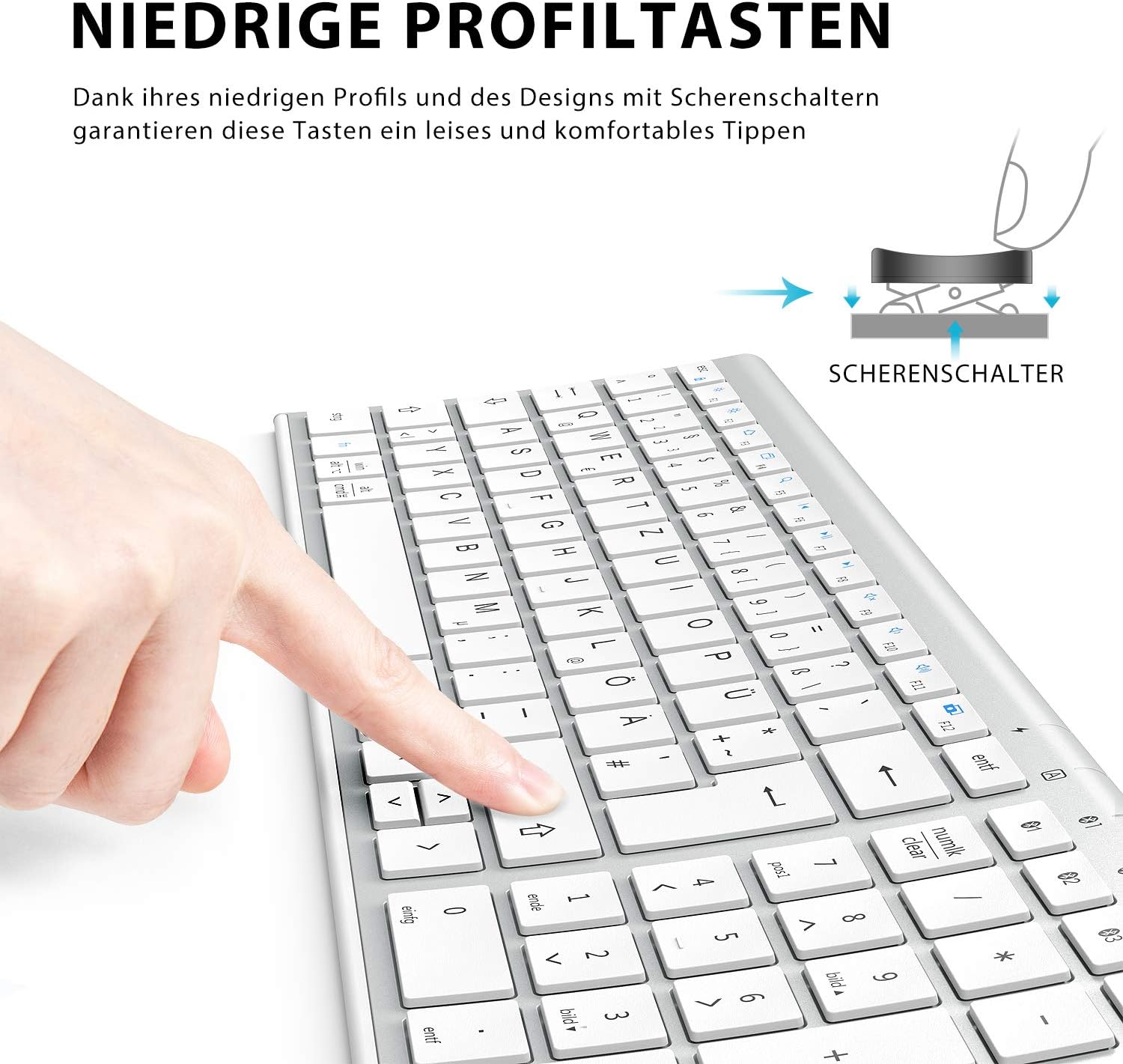 Leises Tippen für volle Konzentration: Leise Scherenschalttasten sorgen für ein Laptop-ähnliches Tippgefühl und reduzieren die Ermüdung der Finger. Ideal für Großraumbüros, Homeoffice und lange Arbeitssitzungen.