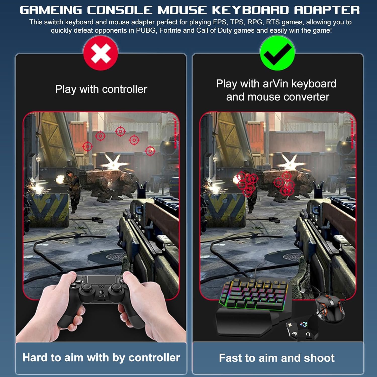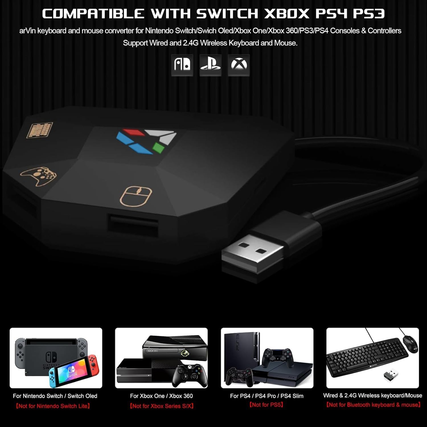 BREIT KOMPATIBEL Der Tastatur- und Mausadapter ist mit den Konsolen Switch/Switch OLED/PS4 Pro/PS4 Slim/PS3/Xbox One/Xbox 360 kompatibel. Hervorragend geeignet für FPS- (Ego-Shooter), TPS- (Third-Person-Shooter), RPG- (Rollenspiele) und RTS- (Echtzeitstrategie) Spiele usw. Bitte beachten Sie: Unterstützt nur kabelgebundene Tastatur und Maus, keine kabellose Tastatur-Maus