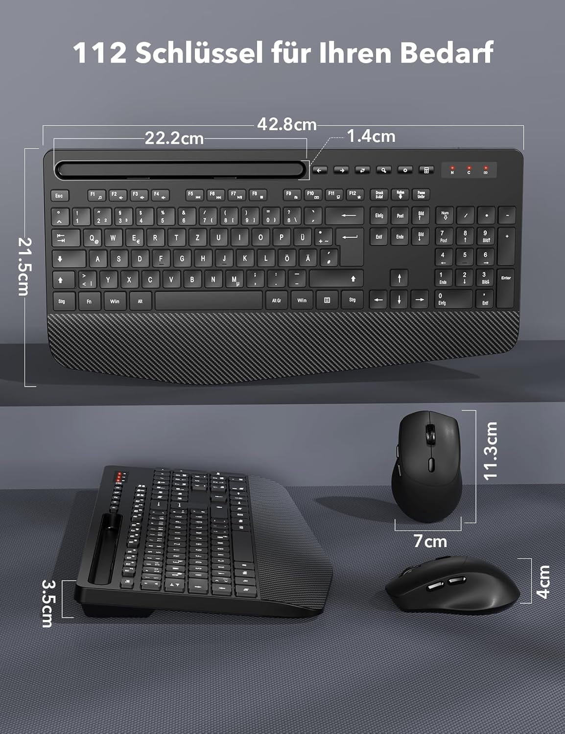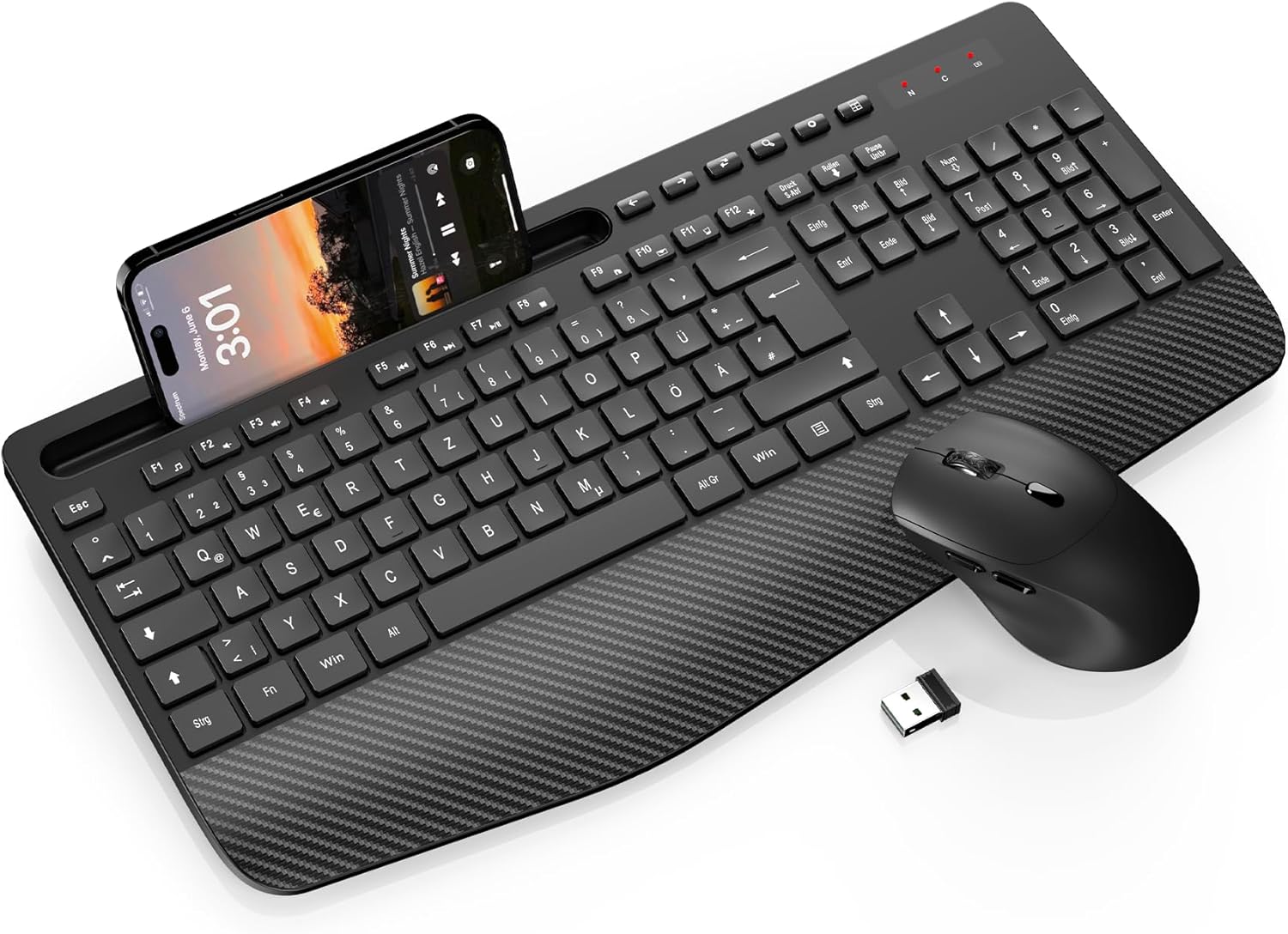 Tastatur in voller Größe mit Halterung: Auch wenn Sie mit diesem Tastatur-Maus-Set arbeiten, verpassen Sie keine Nachrichten von Ihrem Telefon, da die integrierte Halterung Ihr Telefon oder Tablet in einem bestimmten Winkel platzieren kann, um zu lesen oder Videos anzusehen.