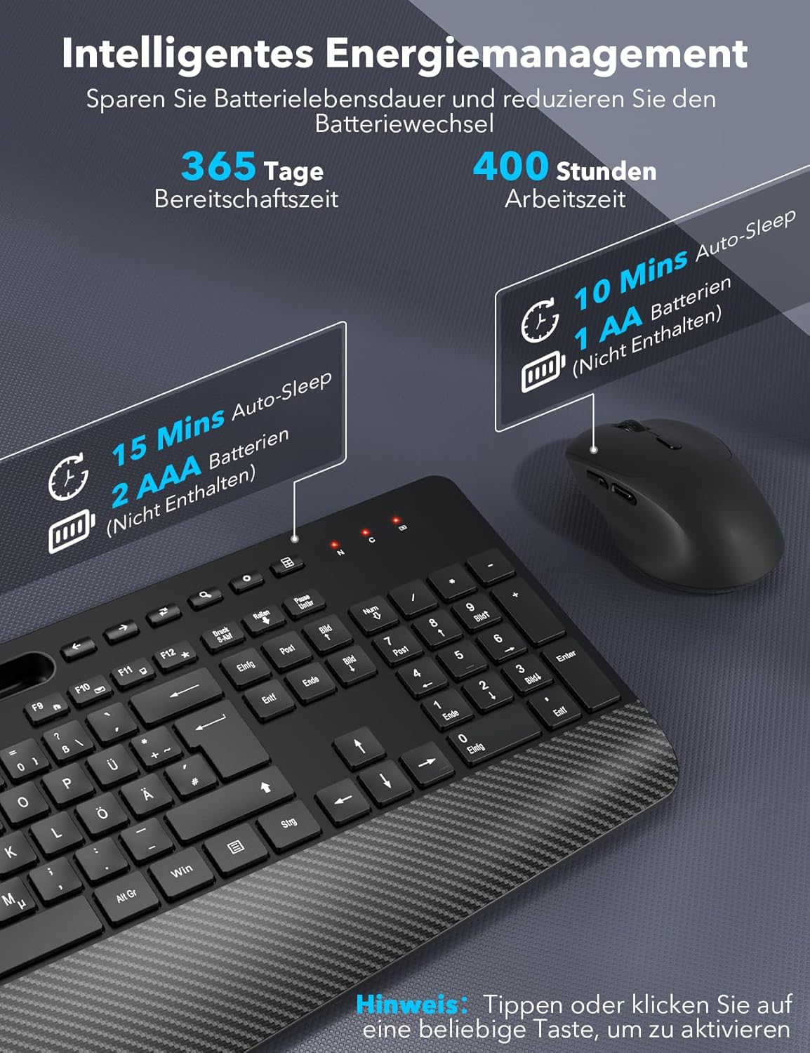 Energieeinsparung und Langlebigkeit: Drahtlose Maus und Tastatur verfügen über einen intelligenten Schlafmodus, um Strom zu sparen. Wenn Sie sich 15 Minuten lang nicht bewegen, wechselt die Tastatur in den Ruhemodus. Wenn Sie sich 10 Minuten lang nicht bewegen, geht die Maus in den Ruhemodus. Drücken Sie eine beliebige Taste, um sie aufzuwecken. Sie können monatelang ohne lästigen Batteriewechsel arbeiten. Die Tastatur benötigt 2 x AAA-Batterien, die Maus benötigt 1 x AA-Batterie. (Batterie nicht im Lieferumfang enthalten)