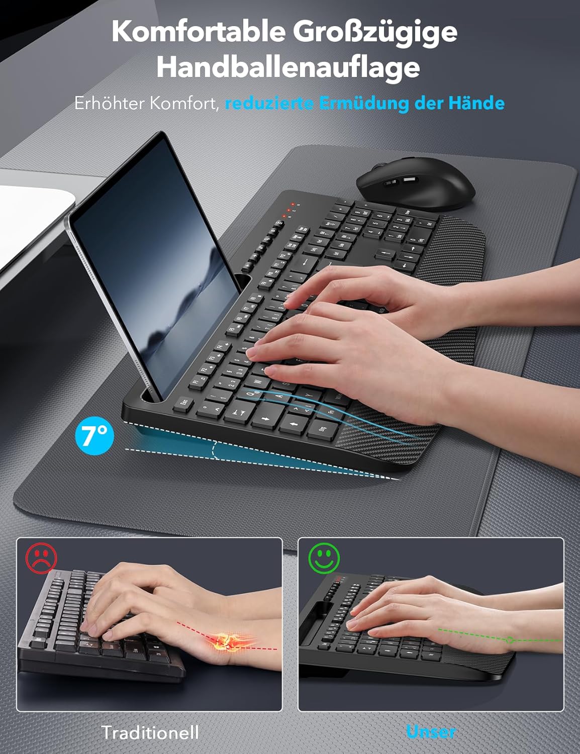 Auf Komfort ausgelegt: Ergonomische Tastatur mit großzügiger Handballenauflage und neigbaren Beinen für eine bessere Schreibposition, um den Druck auf Ihr Handgelenk zu reduzieren. Die kabellose Maus bietet absoluten Komfort mit einem Handshake-Winkel, konturierten Griffen und einer hochwertigen matten Oberfläche. Hinweis: Die Tastatur verfügt nicht über Bluetooth-Funktionalität.