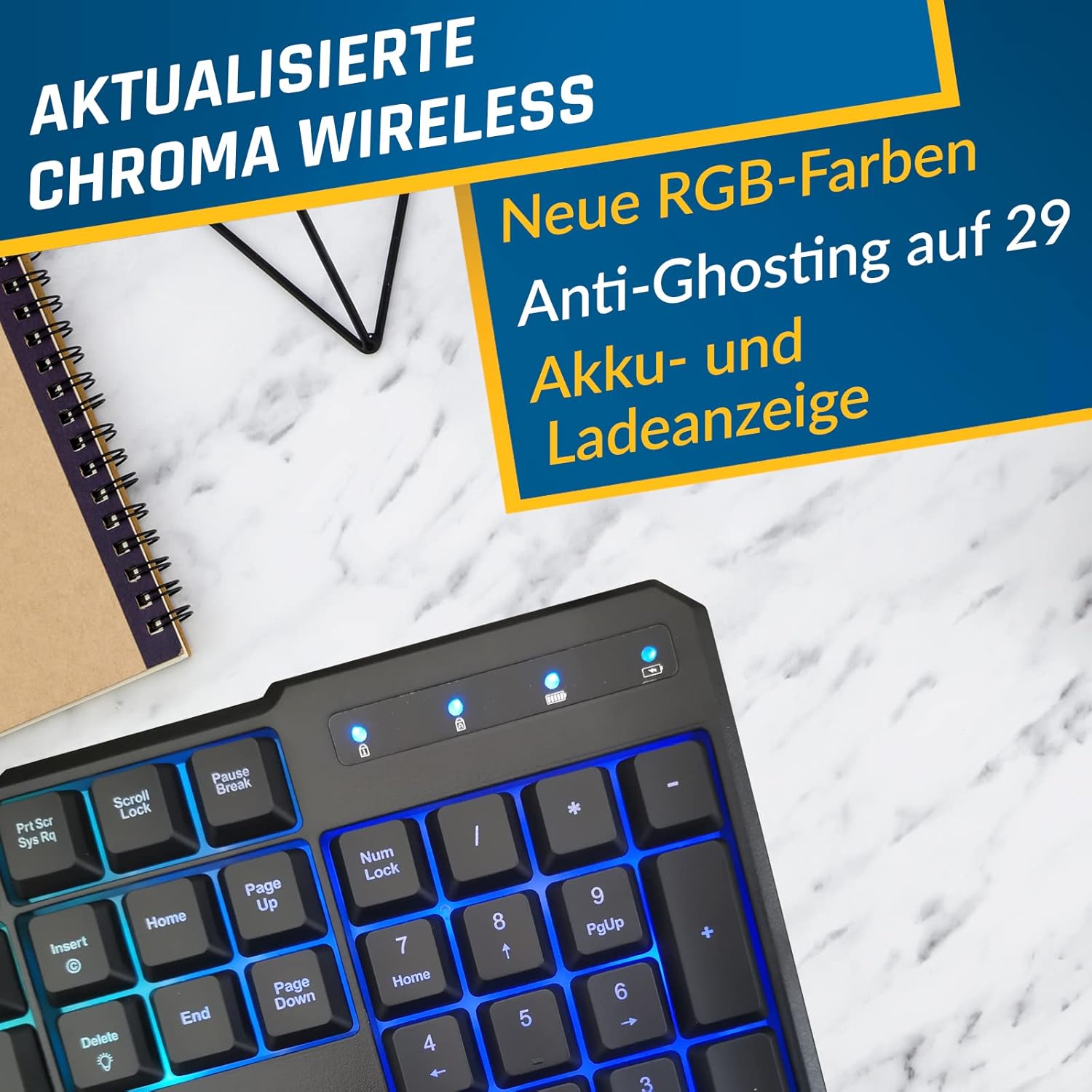 Exklusive und aktualisierte Version. Neue RGB-Effekte + 29 Anti-Ghosting-Tasten + Windows-Sperrfunktion + 2 neue LED-Anzeigen (Akku + Laden). Diese Version des KLIM Chroma Wireless enthält alles, was Sie brauchen, um Ihr Bestes zu geben!