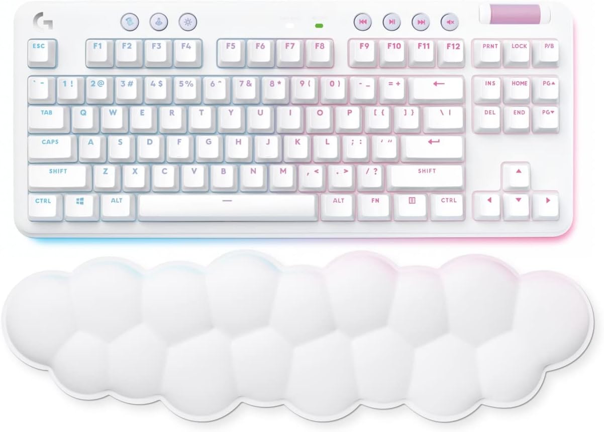 Logitech G 715 Wireless Keyboard with LIGHTSYNC RGB Lightspeed, Tactile Switches (GX Brown) and Wrist Rest, PC/Mac – White