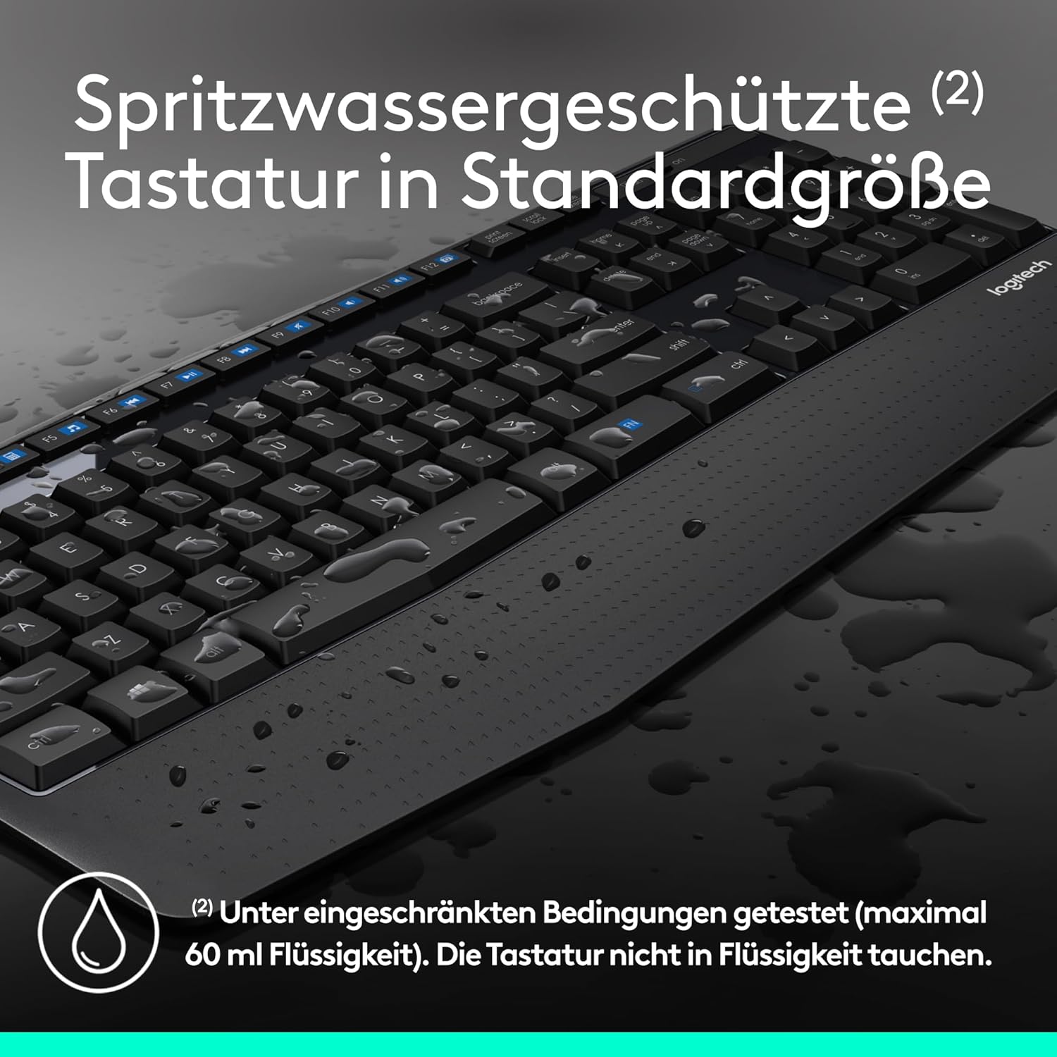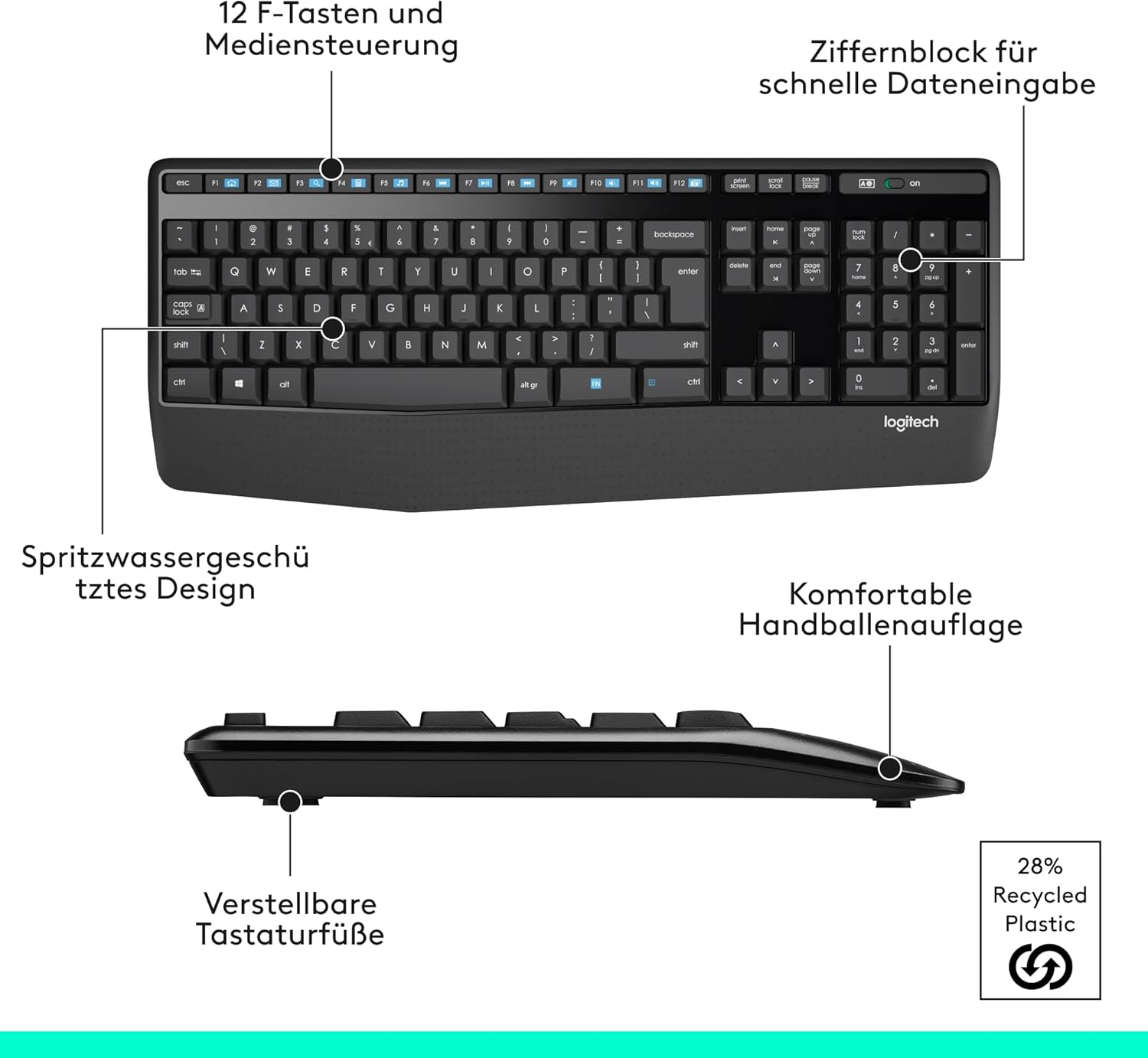 Tastaturlayout in Standardgröße: komfortables, leises Tippen mit Handballenauflage, spritzwassergeschütztem Design (2) und leicht zugänglichen Tasten wie Stummschaltung, Lautstärke und Wiedergabe