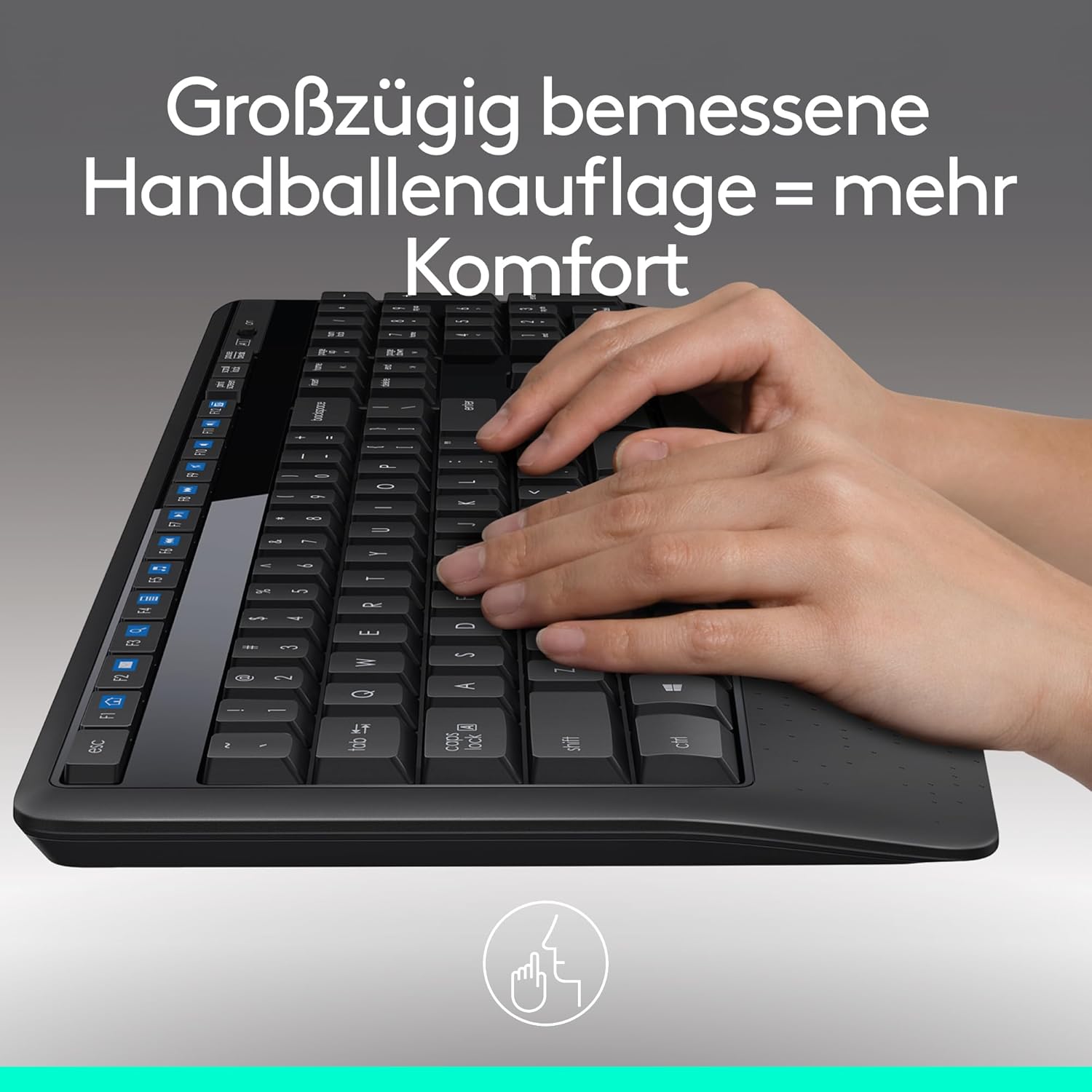 Tippen Sie komfortabel, schnell und präzise auf einer vertrauten Tastatur mit einer großzügigen, strukturierten Handballenauflage, einem robusten, spritzwassergeschützten Design(2)
