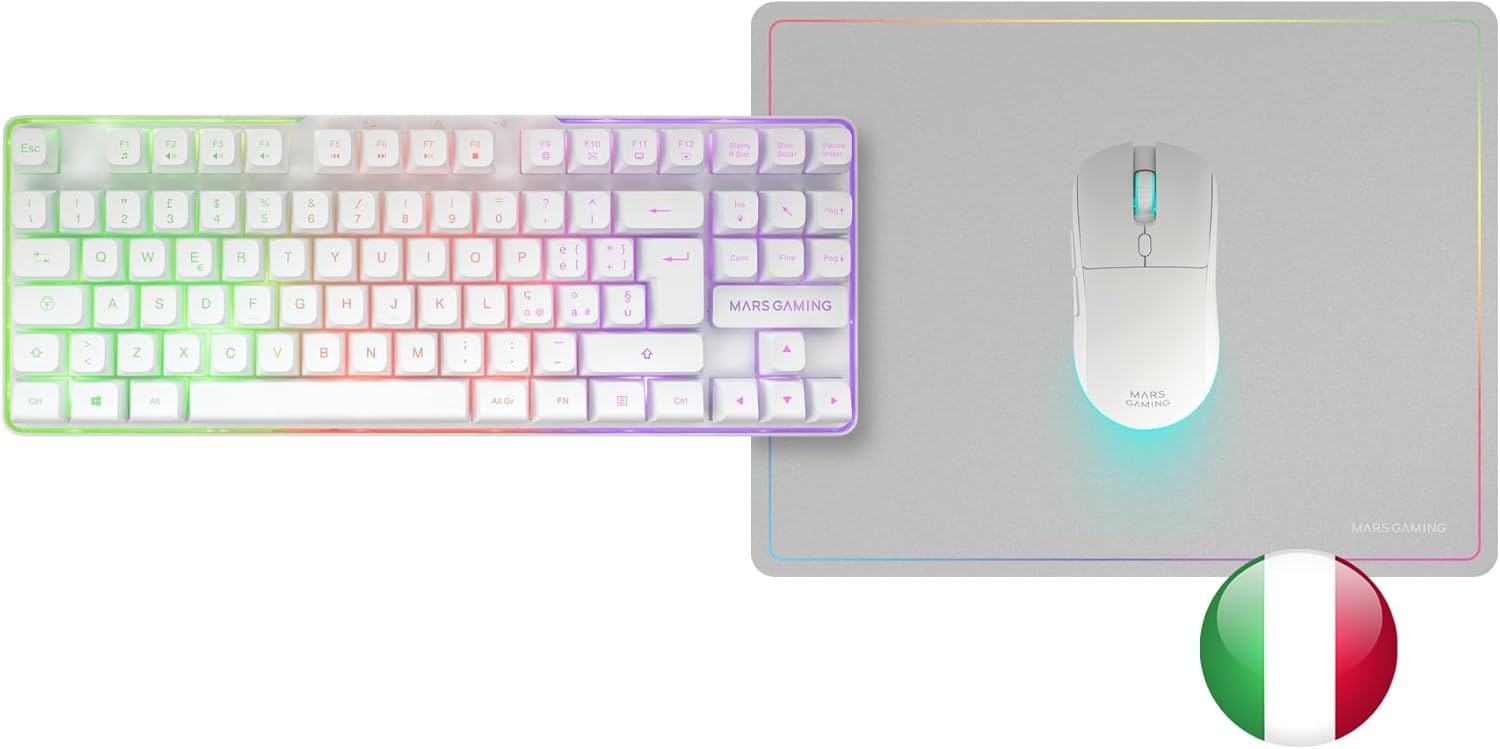 Mars Gaming MCPWTKL, Wireless Gaming Combo, DualPro Link 2.4GPRO Technology, TKL FRGB Rainbow Keyboard + RGB 3200DPI Mouse with HUANO Switches + Non-Slip 360 x 260 mm Mouse Mat, White, Italian
