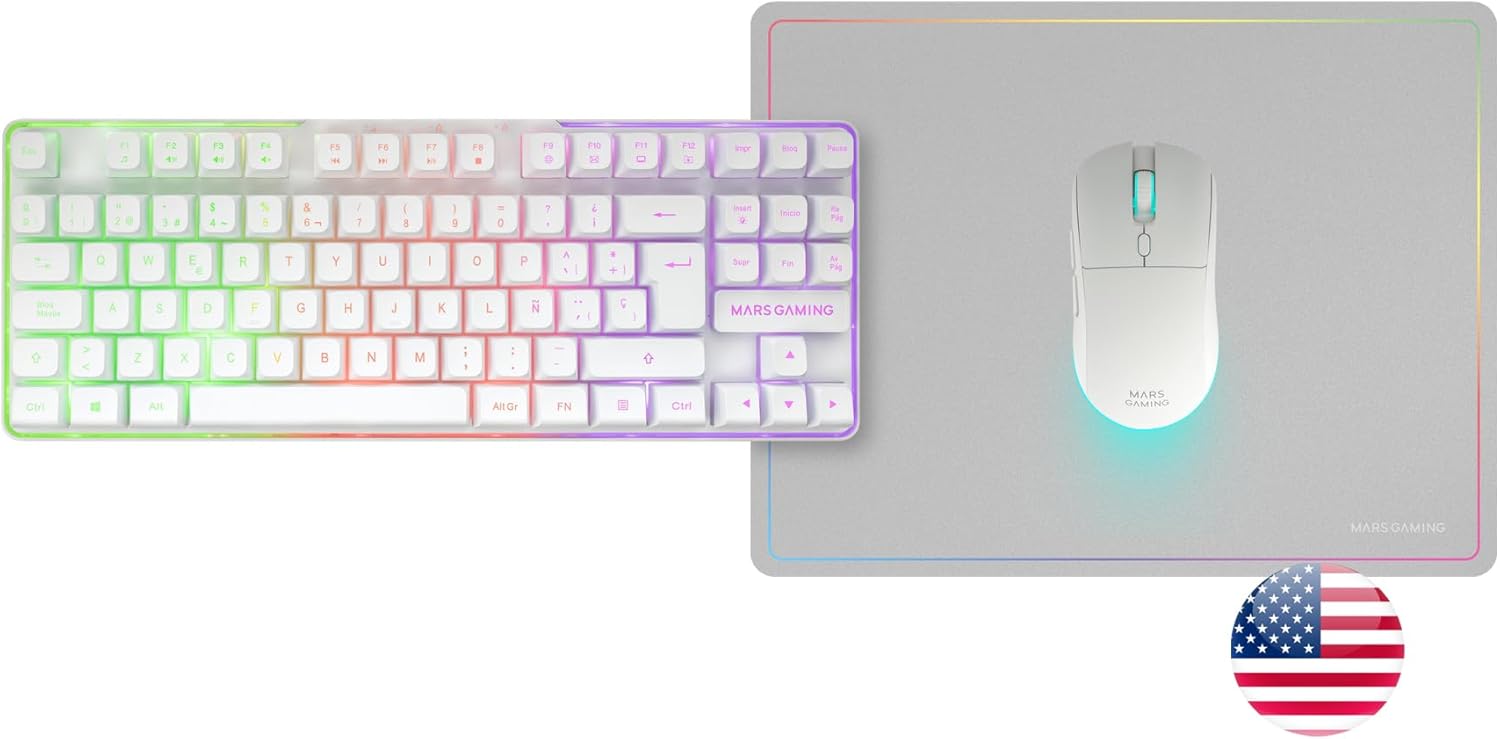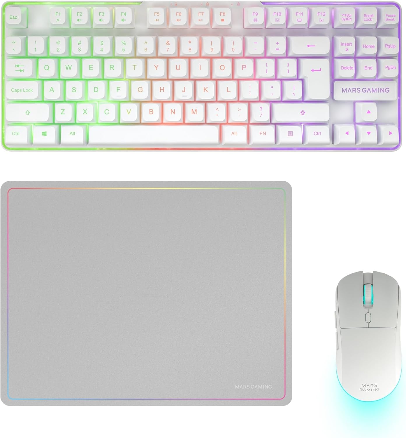 Mars Gaming MCPWTKL, Wireless Gaming Combo, DualPro Link 2.4GPRO Technology, TKL FRGB Rainbow Keyboard + RGB 3200DPI Mouse with HUANO Switches + Non-Slip 360 x 260 mm Mouse Mat, White, English US