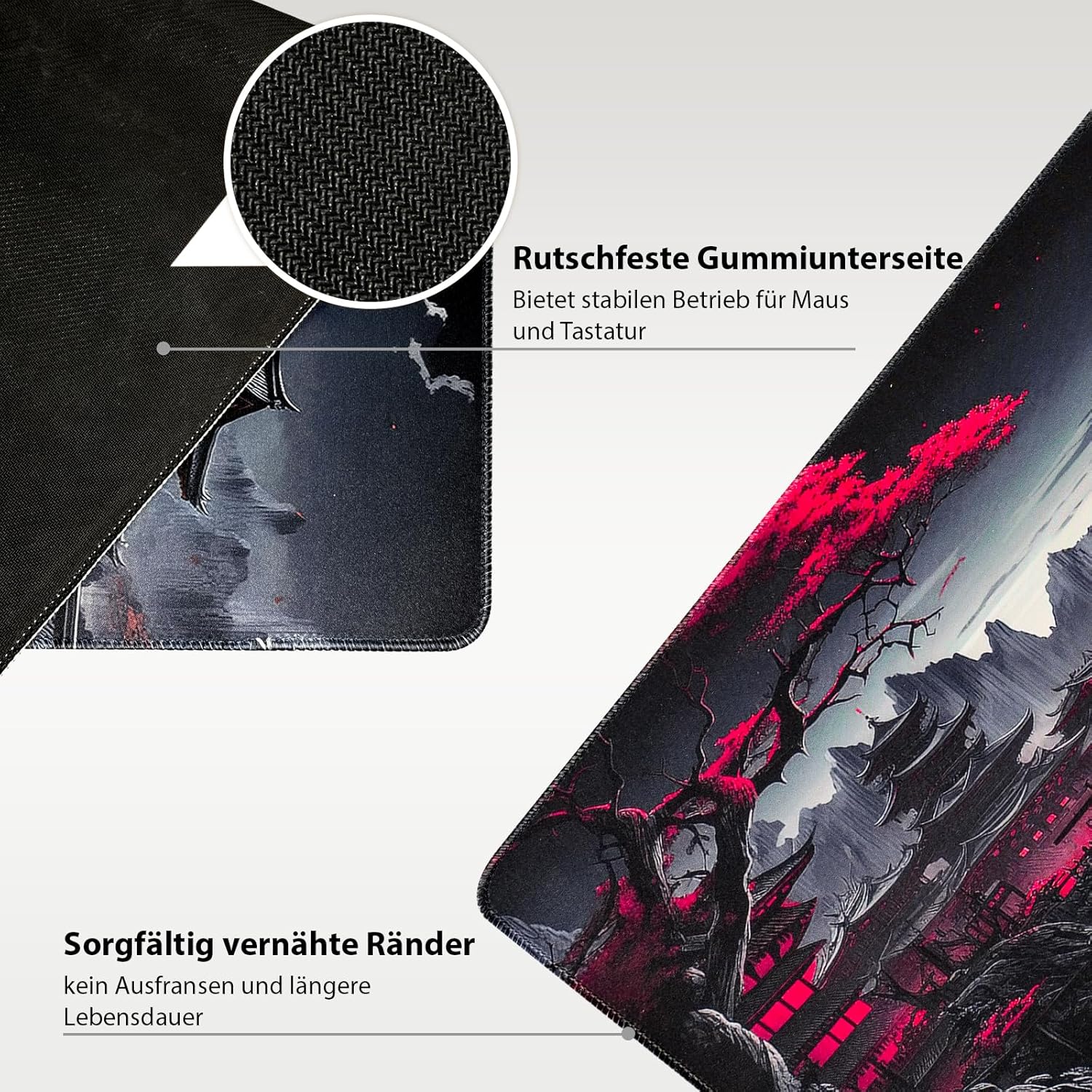 Rutschfeste Gummi-Unterseite: Das Naturkautschuk-Material erhöht die Stabilität, die rutschfeste Textur auf der Unterseite verbessert den Halt. Das Mauspad bleibt auch bei hitzigen Gaming-Sessions immer an Ort und Stelle, Doppelnähte an den Seiten verhindern, dass sich die Tischunterlage mit der Zeit abnutzt
