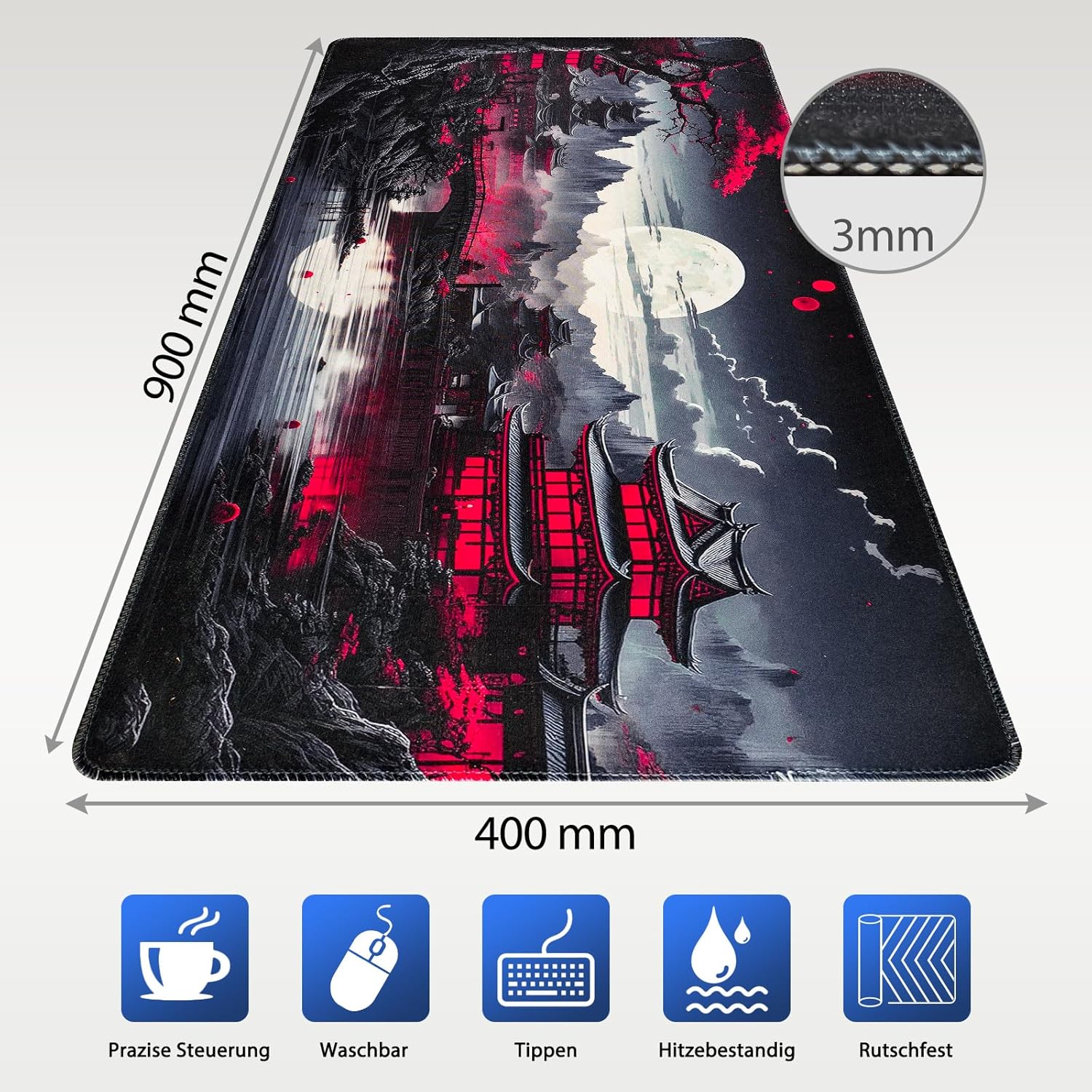 Niviy XXL Gaming Mouse Mat, 900 x 400 mm, Japan Painting Mouse Mat, Oversized Desk Mat with Stitching on the Edges, Non-Slip Table Mat, Gaming, Mouse Mat for PC, Mouse and Keyboard