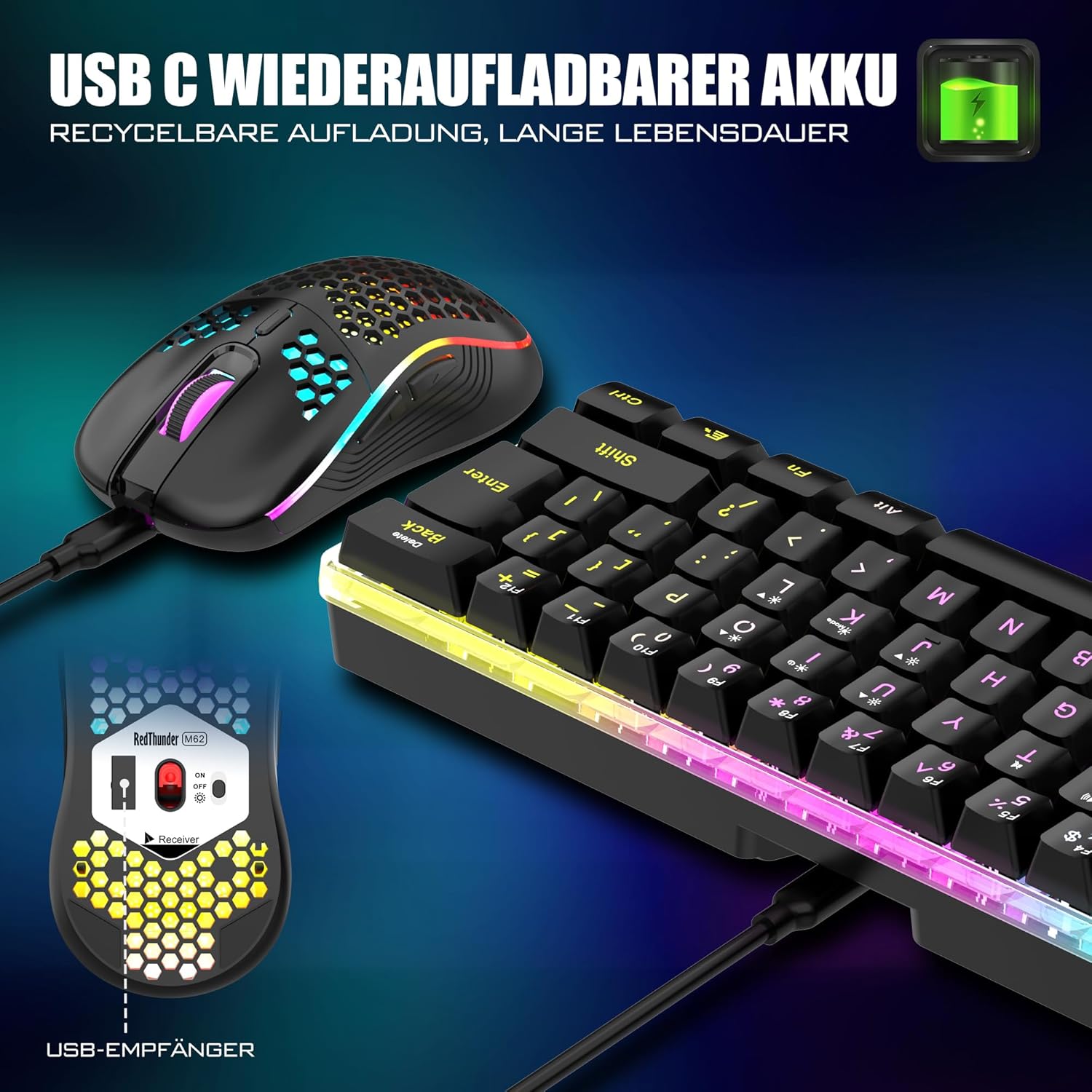 RedThunder 60% Wireless Gaming Keyboard and Mouse Set, QWERTZ DE Layout, Rechargeable Wireless Keyboard with Ultralight Gaming Mouse with Honeycomb Construction, for PC Mac PS5 Xbox Gamer, Office
