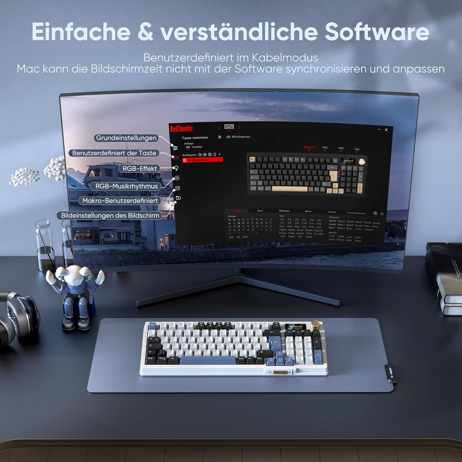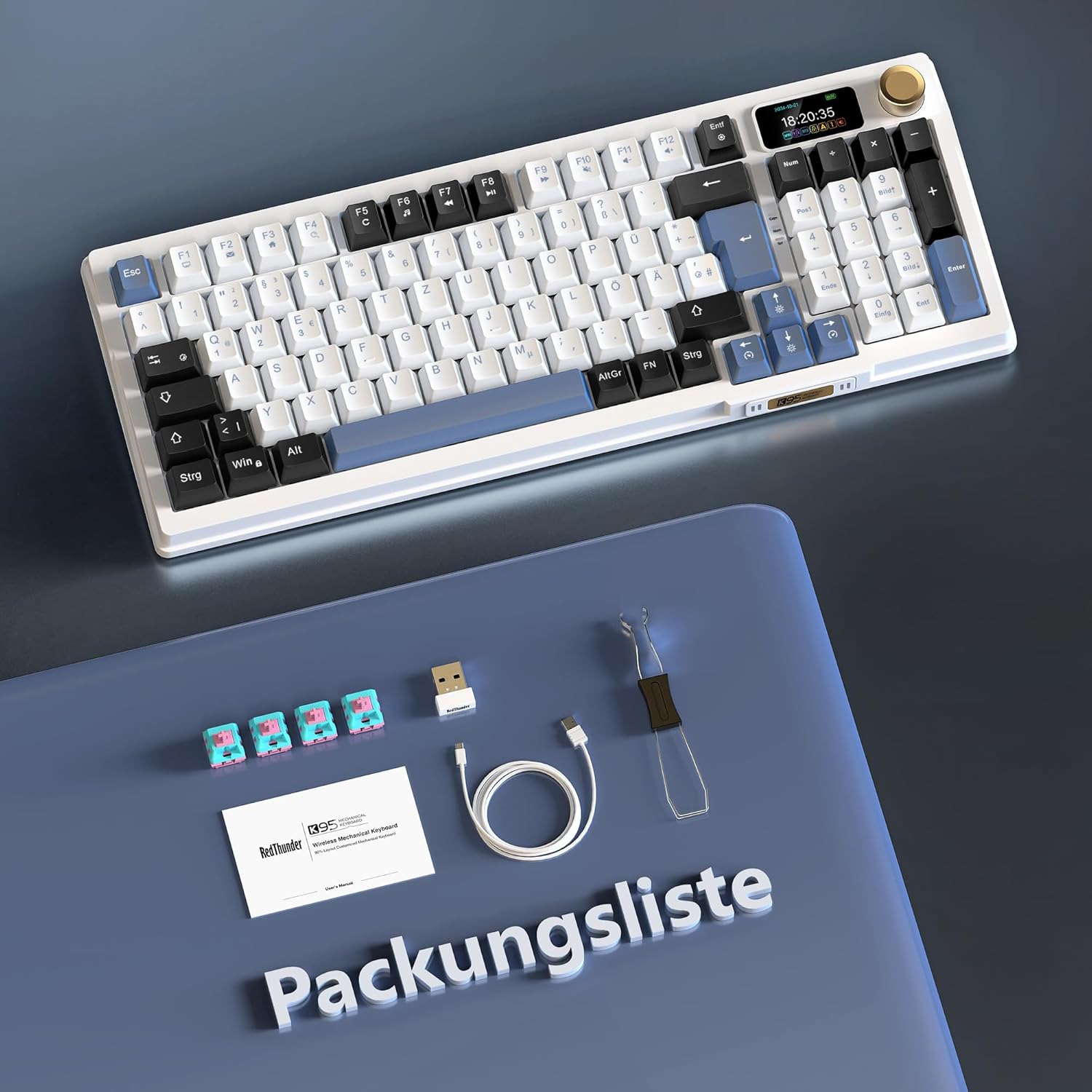 RedThunder K95 Wireless Mechanical Gaming Keyboard with 1.88 Inch TFT Display & Button, QWERTZ 96 Keys Gasket Creamy Keyboard, Tri-Mode Dual System, Hot-swap, Linear Switch, 8000mAh, RGB, Software