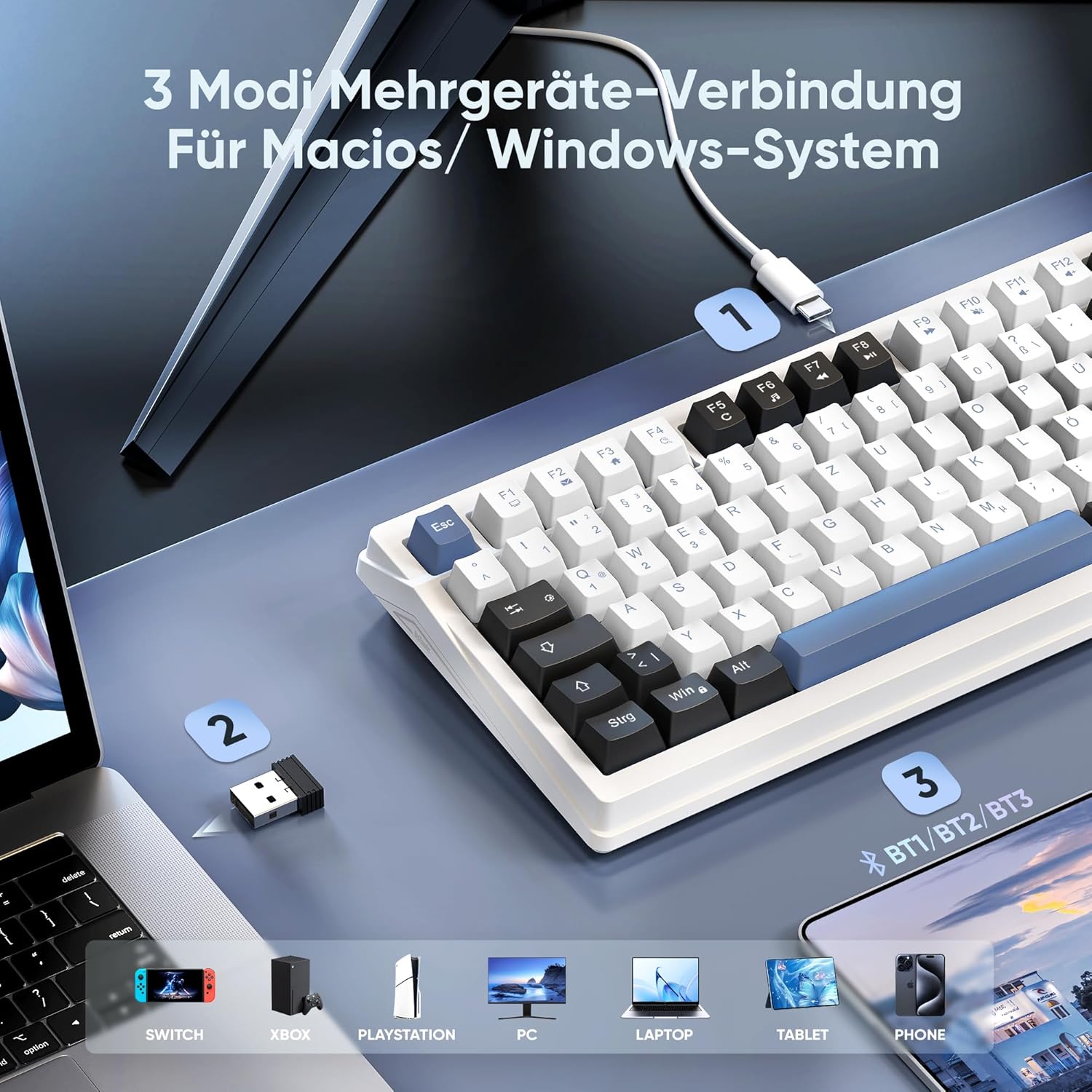 Schalten Sie nahtlos zwischen verschiedenen Geräten im WINDOWS-, MacOS-, 2.4G-Wireless-, Kabel- und BT-Modus um, sodass Sie sich frei in verschiedenen Räumen bewegen können. (Hinweis: FN+Q/W/E kann BT1 /BT2/BT3-Geräte umschalten).