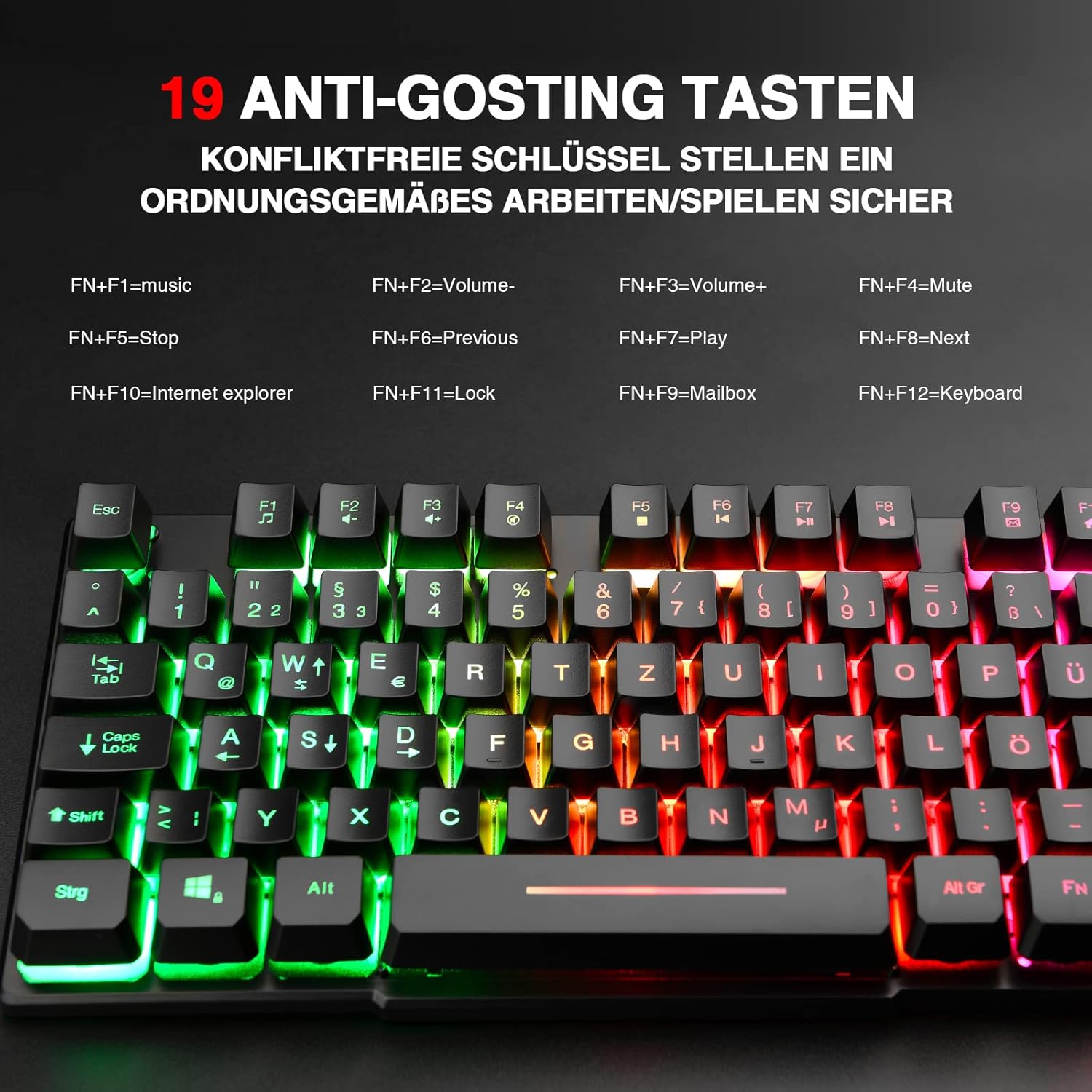 RGB-Hintergrundbeleuchtung: Die coole LED-Hintergrundbeleuchtung der Tastatur mischt eine Vielzahl von Farben. FN + Die Pfeile nach oben und unten ändern die Helligkeit des Lichts.