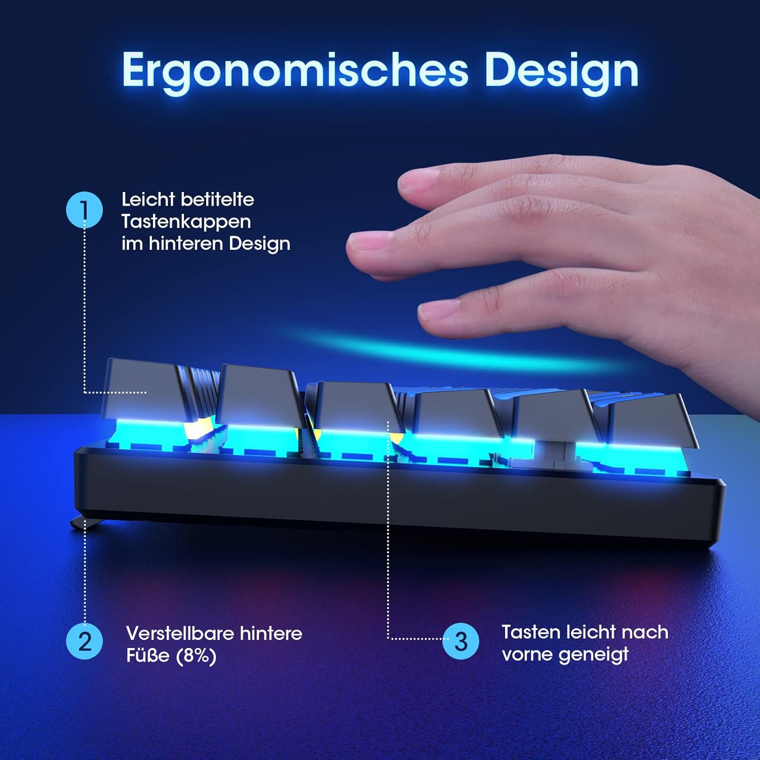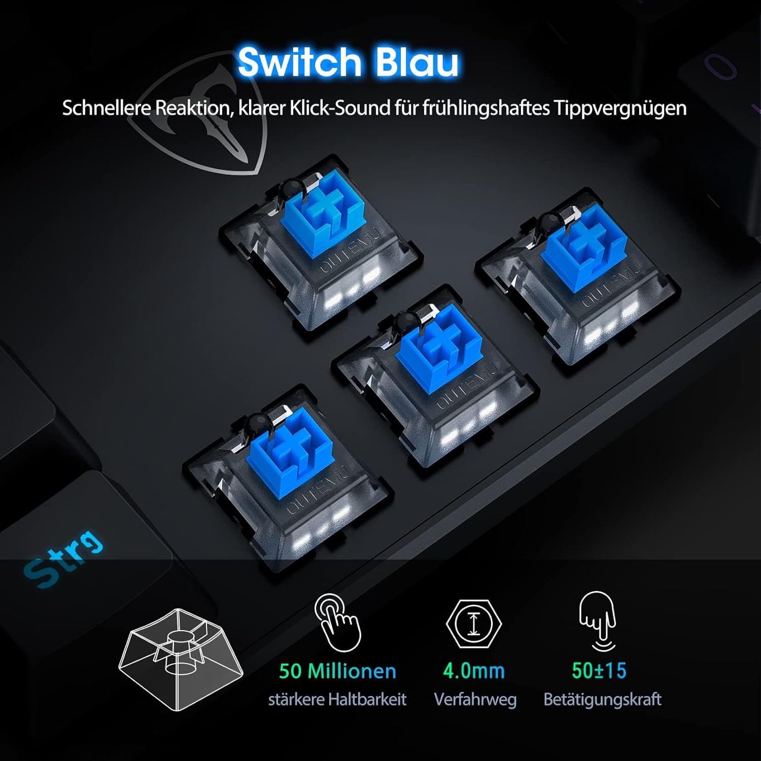 【MECHANISCHE TASTATUR】: Reaktionsschnelle blaue Schalter: Die RisoPhy-Tastatur verfügt über Klicktasten, die Ihnen eine höhere Genauigkeit und schnellere Reaktion mit einem angenehmen Klickgeräusch beim Tippen bieten. Mit dieser Tastatur lässt es sich bequemer tippen, da sie einen tieferen Tastenhub, mehr Feedback und mehr Platz zwischen den Tasten bietet. Für diejenigen, die Tastaturen mit einem angenehmeren Tastgefühl und Klickgefühl bevorzugen, ist unsere blaue Switch-Tastatur eine gute Wahl.
